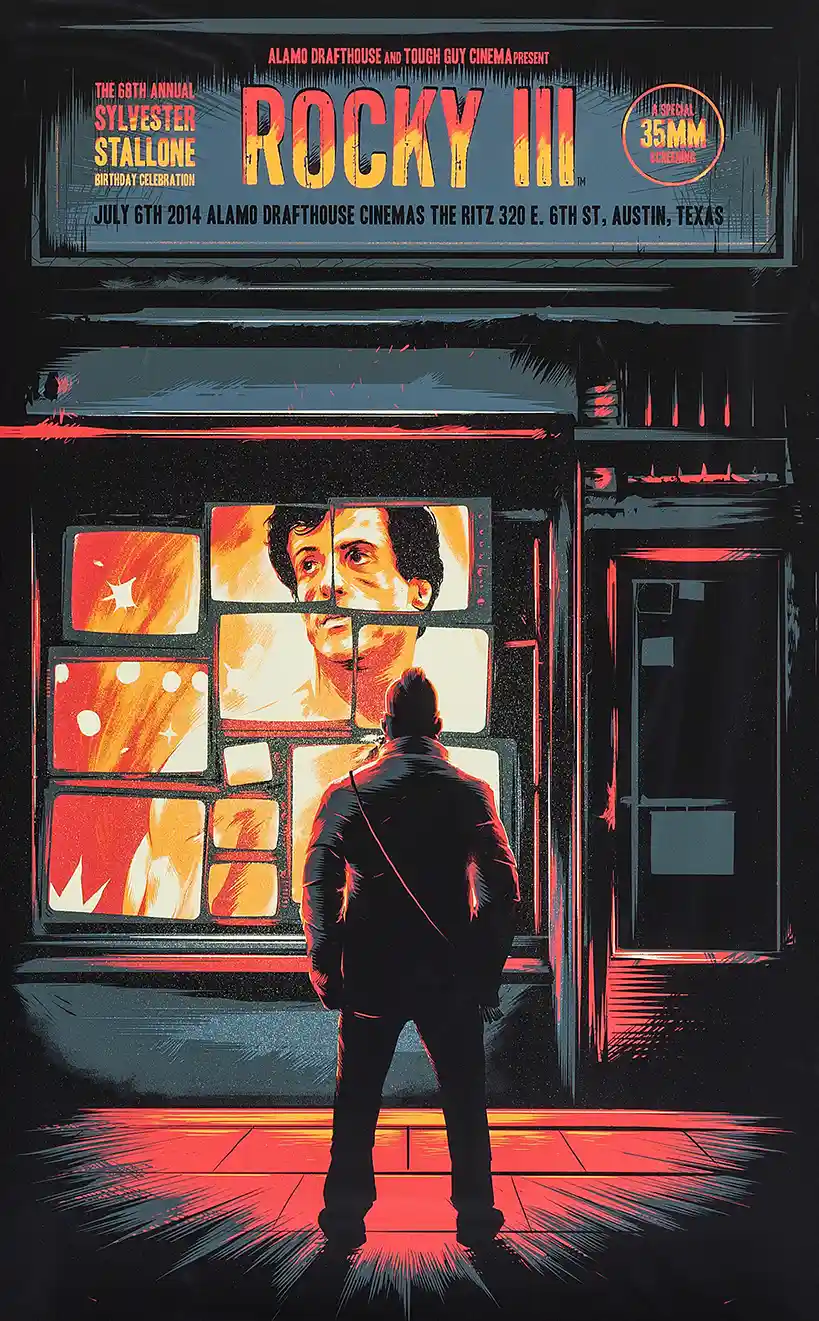 Taylor’s design masterfully uses a fractured television screen motif, reflecting Rocky’s celebrity status and the media’s intense gaze on his battle against Clubber Lang. The central figure—seen only from the back—stands silhouetted against the bright, fiery image of Rocky’s face, symbolizing the emotional distance and isolation that fame can bring. The limited color palette of deep blacks, grays, and explosive reds/oranges perfectly conveys the gritty, high-stakes atmosphere of the film.