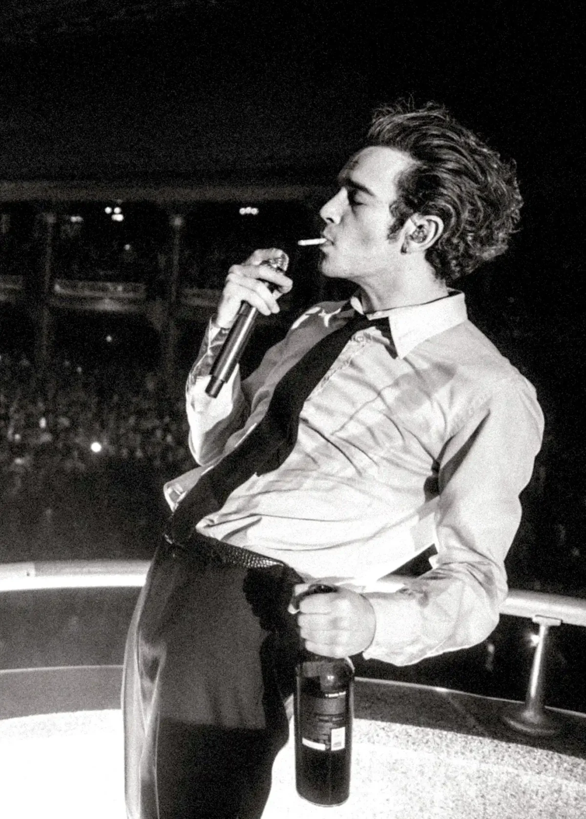 Black and white is, again, the definitive choice for this subject. Matty Healy has been photographed extensively in colour, and those photographs are fine — they document, they promote, they perform the function of contemporary music photography. But the black and white smoking print does something different. It removes Healy from any specific moment — there is no tour, no album cycle, no specific year legible in the image — and turns him into an icon in the older sense of the word: a figure who stands for something beyond himself, caught in an image that will not date because it was never quite located in time. The cigarette, rendered in monochrome, is not a lifestyle detail. It is a compositional element — a line of light in a field of grey, an anchor for the figure’s energy, a visual rhyme for the way Healy holds himself on stage and in interview and in every photograph that actually gets him right.