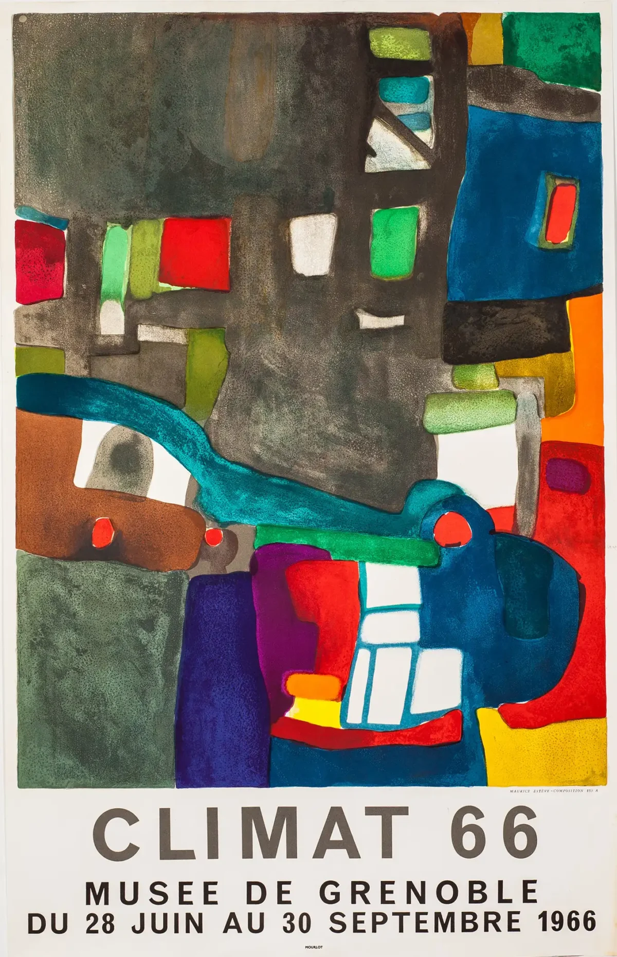 Celebrate the genius of 20th-century French abstraction with this stunning exhibition poster for Maurice Estève’s ‘Climat 66’, originally created for the Musée de Grenoble in 1966. Estève was a master of Lyrical Abstraction, and this print showcases his distinctive style: an exciting and dynamic composition featuring interlocking, organic shapes filled with bold, primary colors—deep blues, vibrant reds, and rich greens. The abstract visual complexity is beautifully balanced by the strong, textured dark background, making this poster a compelling piece of mid-century wall art that anchors any room.