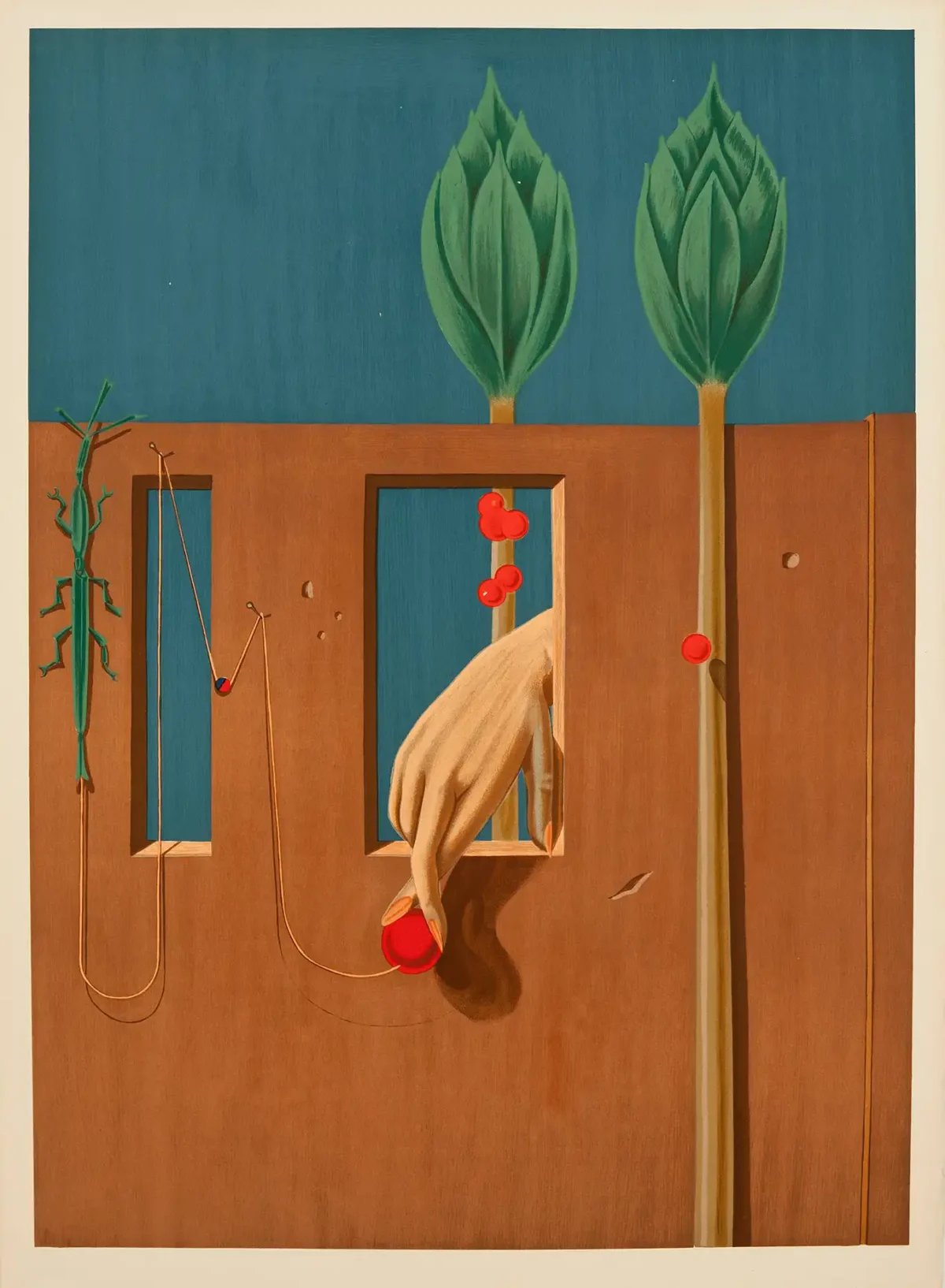 Dive into the mesmerizing world of Surrealism with this exceptional poster print of Max Ernst’s 1923 masterpiece, “At the First Clear Word” (Au premier mot clair). This iconic piece captures the enigmatic and dreamlike quality central to the Dada and Surrealist movements. The composition is unnerving yet meticulous, featuring a nude hand reaching through a window, connected by a string to a red object, set against a stark facade. The detailed depiction of the green stick insect and the stylized agave-like plants create a rich visual puzzle, making this artwork an essential statement piece for any collector of 20th-century modern art.