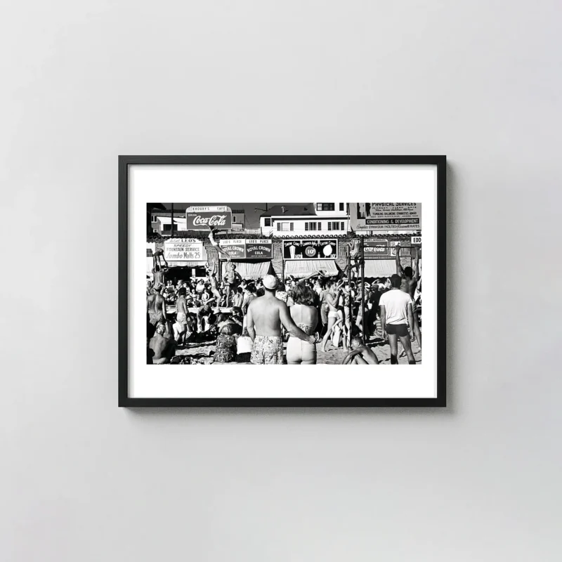 - Design & vibe: High-contrast monochrome — bodies in motion, crowds watching, the Santa Monica seafront as backdrop. This black and white beach art has the graphic energy and social richness of Yavno’s San Francisco work applied to a Southern California subject. Muscle Beach photo print as California street photography: vintage fitness photo that shows the birth of a culture. Max Yavno print at his most exuberant and historically essential.