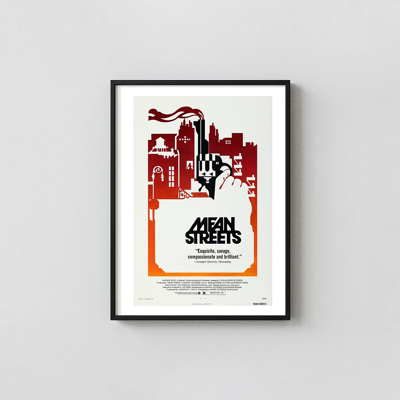 This stunning reproduction captures the raw energy and graphic brilliance of the original 1973 Mean Streets movie poster. Directed by the legendary Martin Scorsese and starring Robert De Niro and Harvey Keitel, this film defined a generation of cinema. The poster itself is a masterpiece of design, utilizing bold, high-contrast imagery—a looming cityscape silhouette rendered in rich red and orange gradients, dominated by the stark black outline of a handgun. This powerful visual narrative perfectly encapsulates the gritty, violent world of New York’s Little Italy, making it a must-have piece of wall art for any serious film collector or cinema historian.