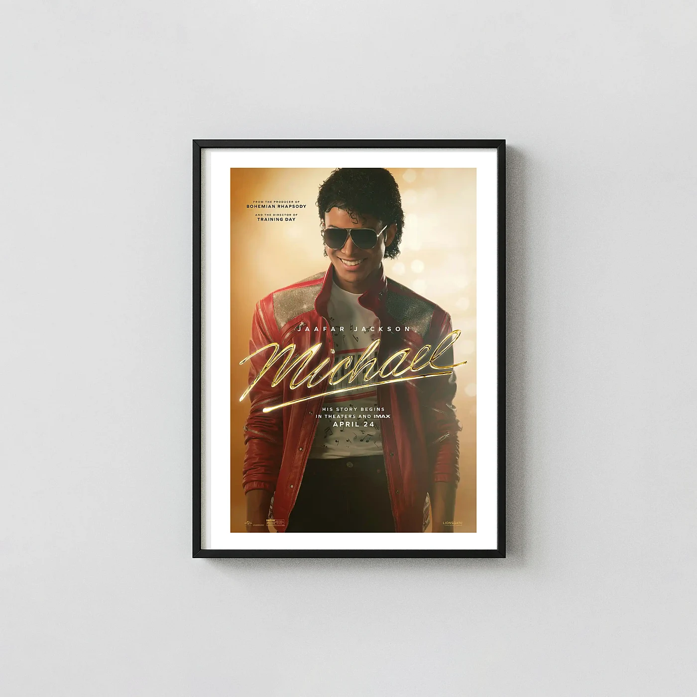 Capture the anticipation of the official Michael Jackson biopic, Michael, with this stunning movie poster. Featuring Jaafar Jackson embodying the King of Pop during his iconic ’80s era, this print showcases the legendary red and silver jacket and classic aviator sunglasses. The shimmering gold title treatment—’Michael’—dominates the foreground, setting a dazzling, superstar tone. This wall art celebrates the legacy of the greatest entertainer of all time, making it an essential piece of decor for music lovers and film enthusiasts alike.