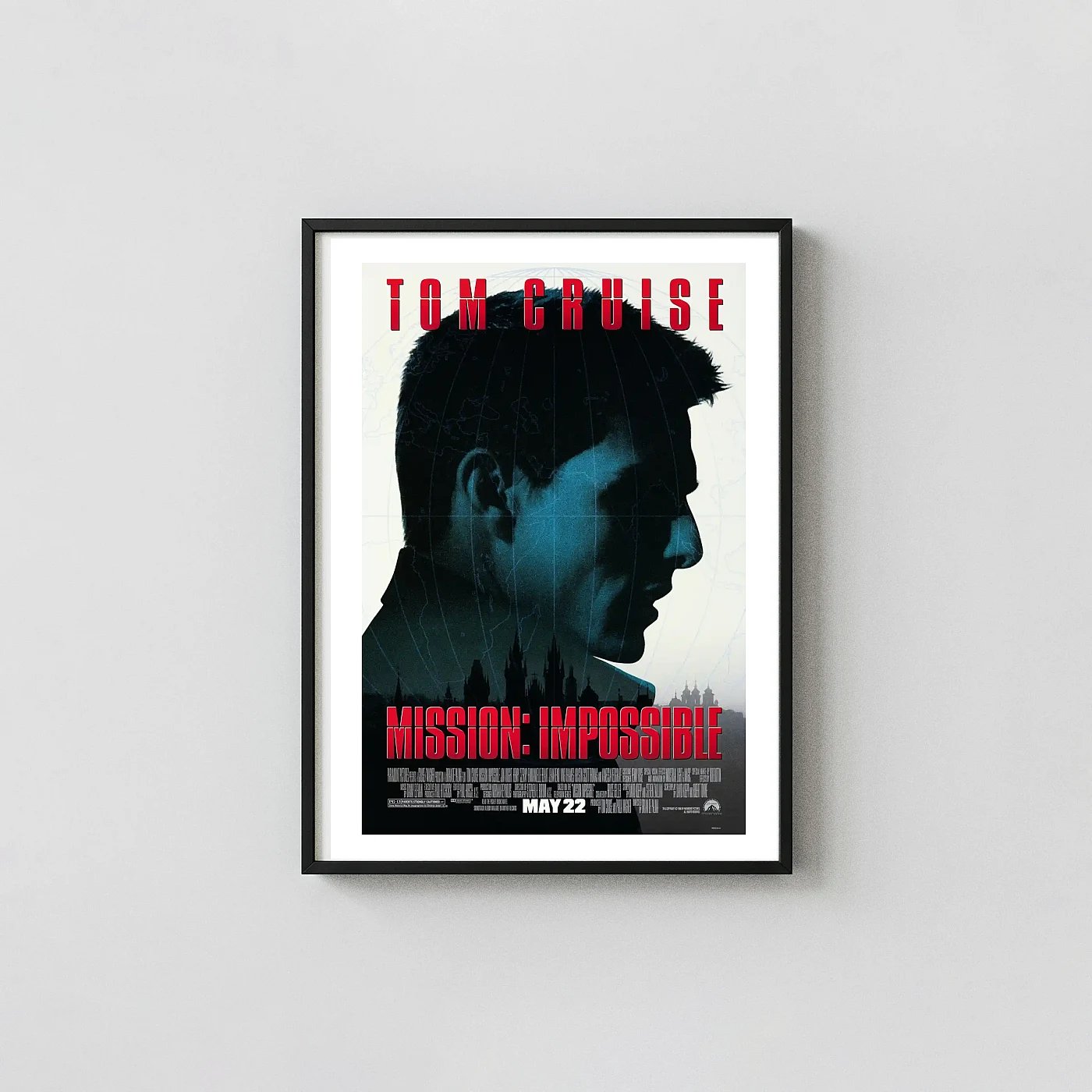 This striking poster captures the essence of the 1996 spy masterpiece, Mission: Impossible, launching the legendary film series. Featuring a moody, dark silhouette profile of Tom Cruise as Ethan Hunt, overlaid with a subtle global map grid, this design immediately signals the high-stakes international espionage that defines the film. The subtle inclusion of the Prague cityscape at the base adds a layer of mystery and atmosphere, making this piece essential cinema decor for fans of the franchise and classic 90s thrillers. Display the poster that started it all.