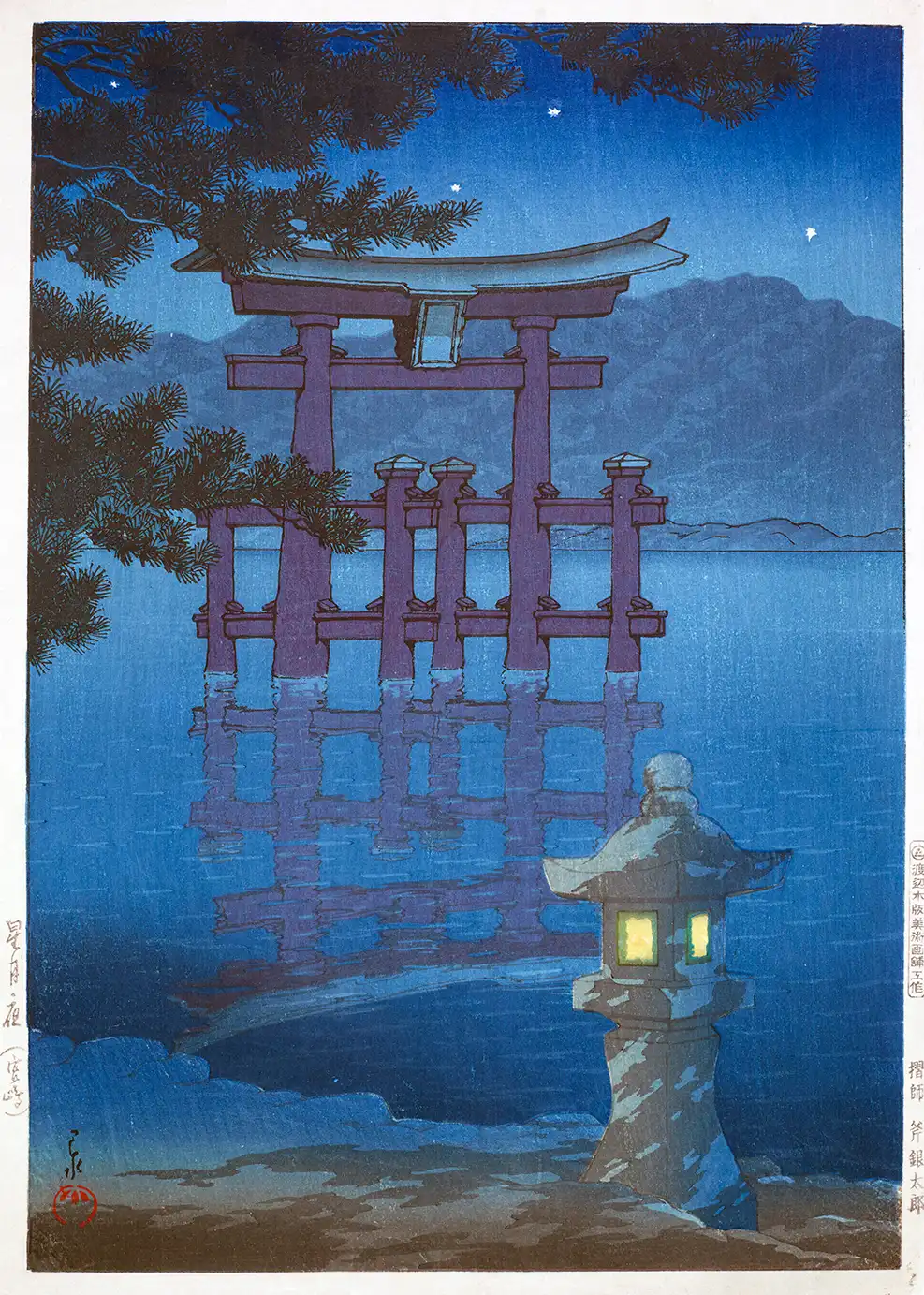 The visual depth of this Miyajima torii gate print is achieved through the use of high-contrast layering. The starlit sky is rendered with a heavy saturation of midnight blue, punctuated by precise, small stars that provide a sense of vastness. The reflection of the torii gate in the water is not merely a mirror image but a distorted, fluid interpretation that suggests the gentle movement of the tide. This attention to environmental detail is what makes shin-hanga night scene prints so desirable for collectors who appreciate Japanese landscape wall art. The silhouette of the pine branches in the upper left adds a natural frame to the piece, anchoring the viewer within the coastal environment of Itsukushima.