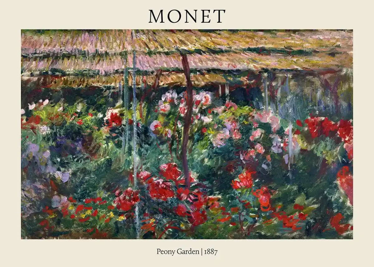 Adorn your space with the masterful colors and expressive brushwork of Claude Monet’s Peony Garden, painted in 1887. This exquisite reproduction captures the essence of French Impressionism, showcasing a riot of deep reds, delicate pinks, and lush greens. Monet, the quintessential painter of light and nature, immortalized the transient beauty of his floral subjects, making this piece a perfect centerpiece for any room seeking a touch of historical elegance and vibrant natural energy.