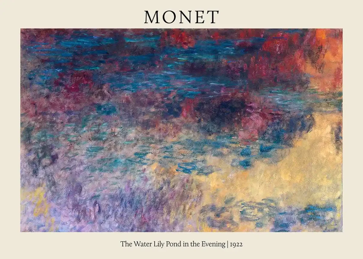 Bring the captivating intensity of Claude Monet’s final years into your home with this stunning reproduction of The Water Lily Pond in the Evening (1922). Part of the legendary Nymphéas series, this particular work transcends traditional Impressionism, leaning toward abstraction and pure color exploration. It captures the atmosphere of the artist’s famous water garden at Giverny as dusk falls, transforming the serene pond into a canvas of explosive, raw emotion.