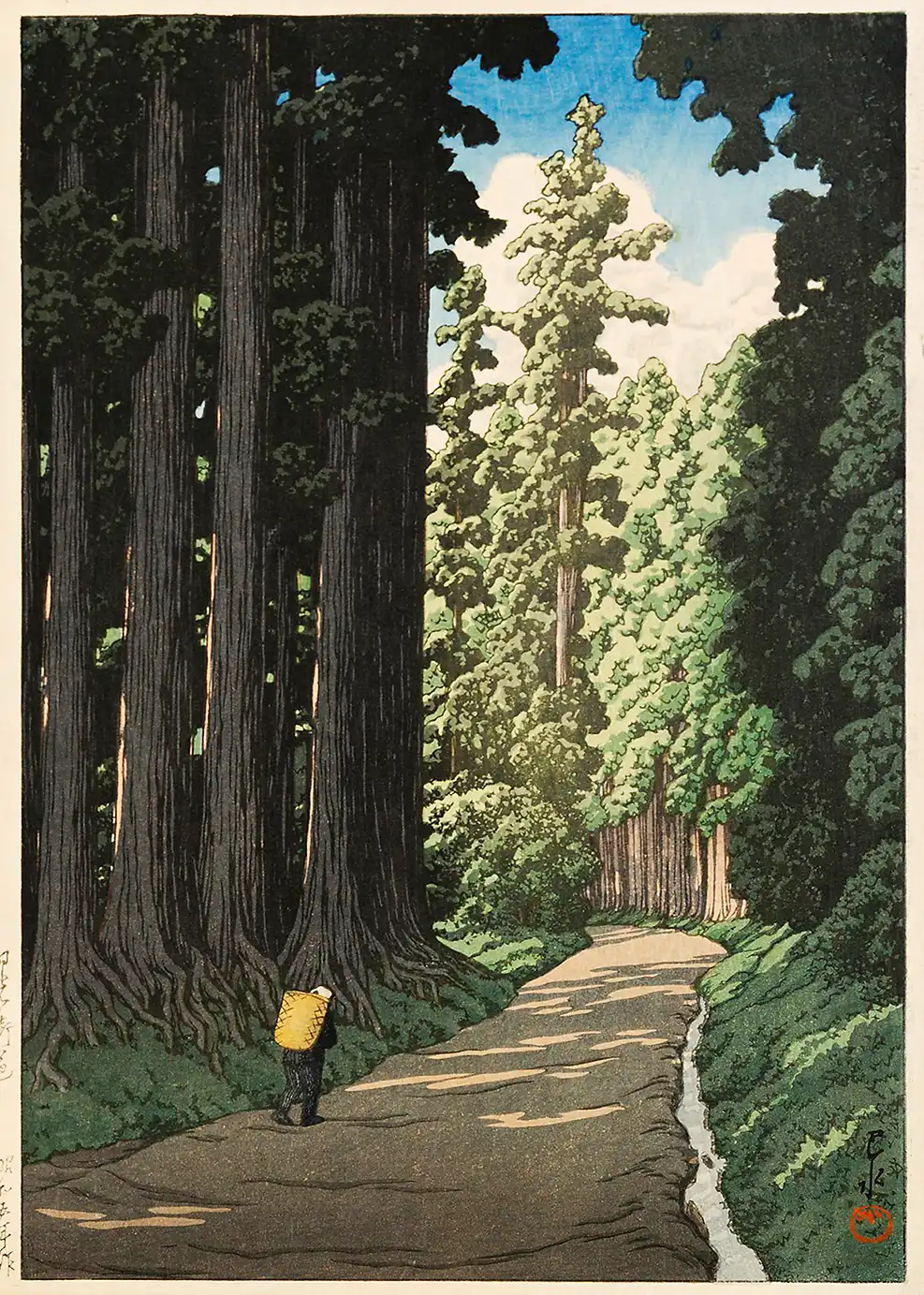 The early 20th century marked a transition in Japanese printmaking. The Shin-hanga movement sought to revitalize the traditional Ukiyo-e style by incorporating Western elements like realistic lighting and perspective. Kawase Hasui was a central figure in this era, and his 1930 depiction of Nikko remains a significant example of his travel series. This specific Nikko woodblock print highlights the intersection of natural beauty and human presence. By focusing on the massive trees rather than just the historic shrines, the artist emphasizes the raw power of the Japanese forest environment.