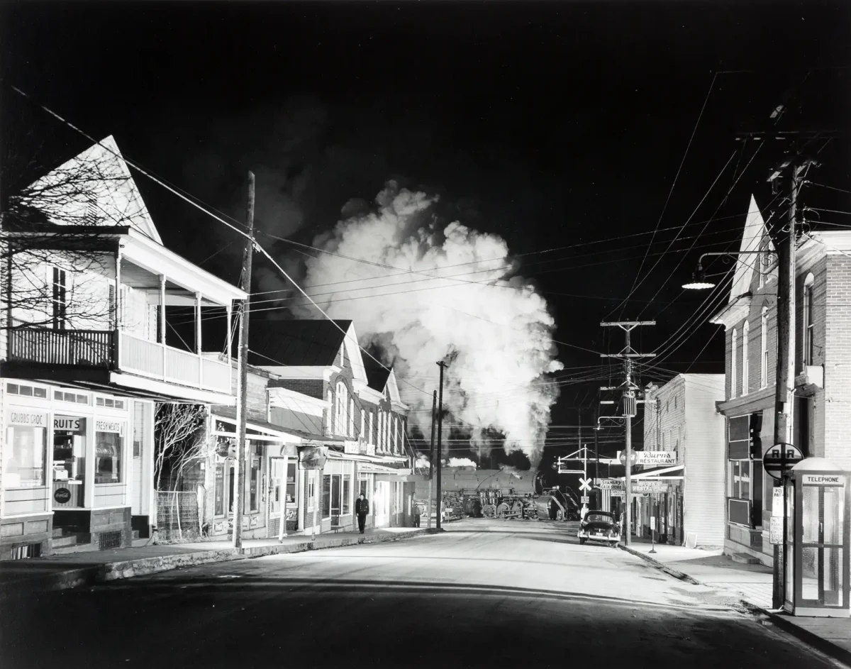 This O. Winston Link print captures the town of Stanley, Virginia in 1957 — a night scene lit entirely by Link’s elaborate flash setups, the Norfolk and Western Railway locomotive cutting through a landscape that feels both documentary and theatrical.