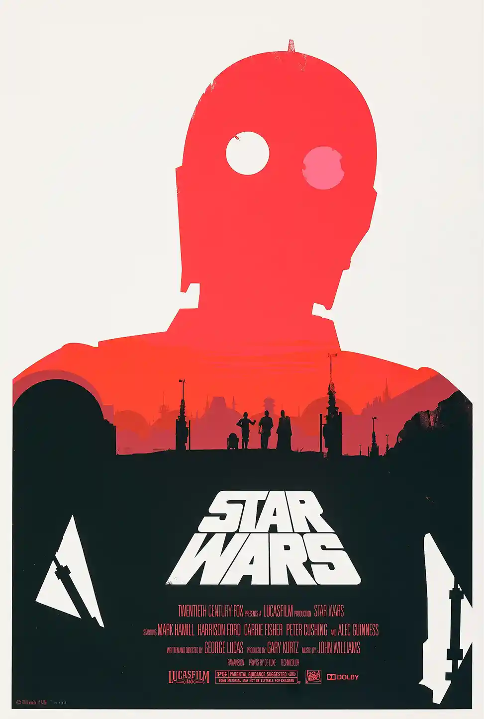 Moss’s brilliant design captures the essence of the 1977 original film using dramatic, high-contrast silhouettes. The poster features the towering, abstract red silhouette of a protocol droid (evocative of C-3PO) commanding the foreground. Within this silhouette, a breathtaking vista of Tatooine unfolds, painted in layers of deep red and black, showing the iconic silhouettes of Luke Skywalker, Obi-Wan Kenobi, R2-D2, and C-3PO traversing the desert landscape.