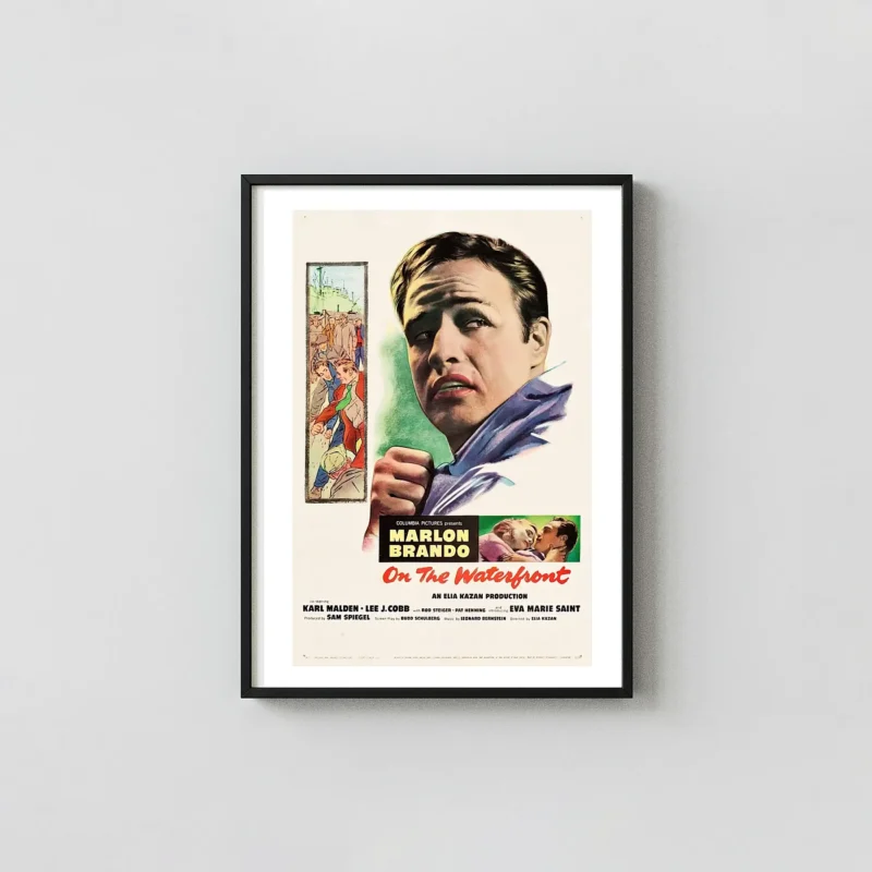 Bring home the iconic drama with this On The Waterfront poster featuring Marlon Brando. Premium quality wall art, perfect decor for classic film fans. Order now!