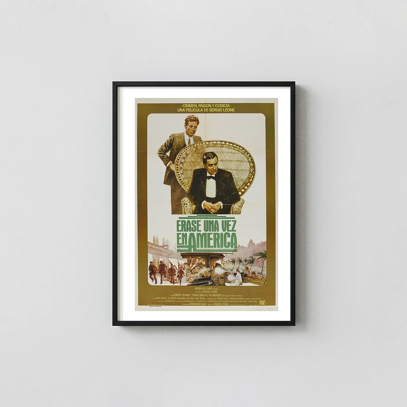Capture the sweeping epic of Sergio Leone’s masterpiece with this stunning vintage movie poster. This specific artwork, featuring the Spanish release title ‘Érase una vez en América,’ offers a unique, illustrated portrayal of the film’s central themes: crime, passion, and decades of regret. The design prominently showcases Robert De Niro as Noodles, seated regally in a tuxedo and a wicker peacock chair, juxtaposed above dynamic scenes of the gang running through the streets and engaging in Prohibition-era shootouts. It’s a powerful piece of wall art that encapsulates the tragic romance and brutal history of Leone’s final, ambitious cinematic statement.