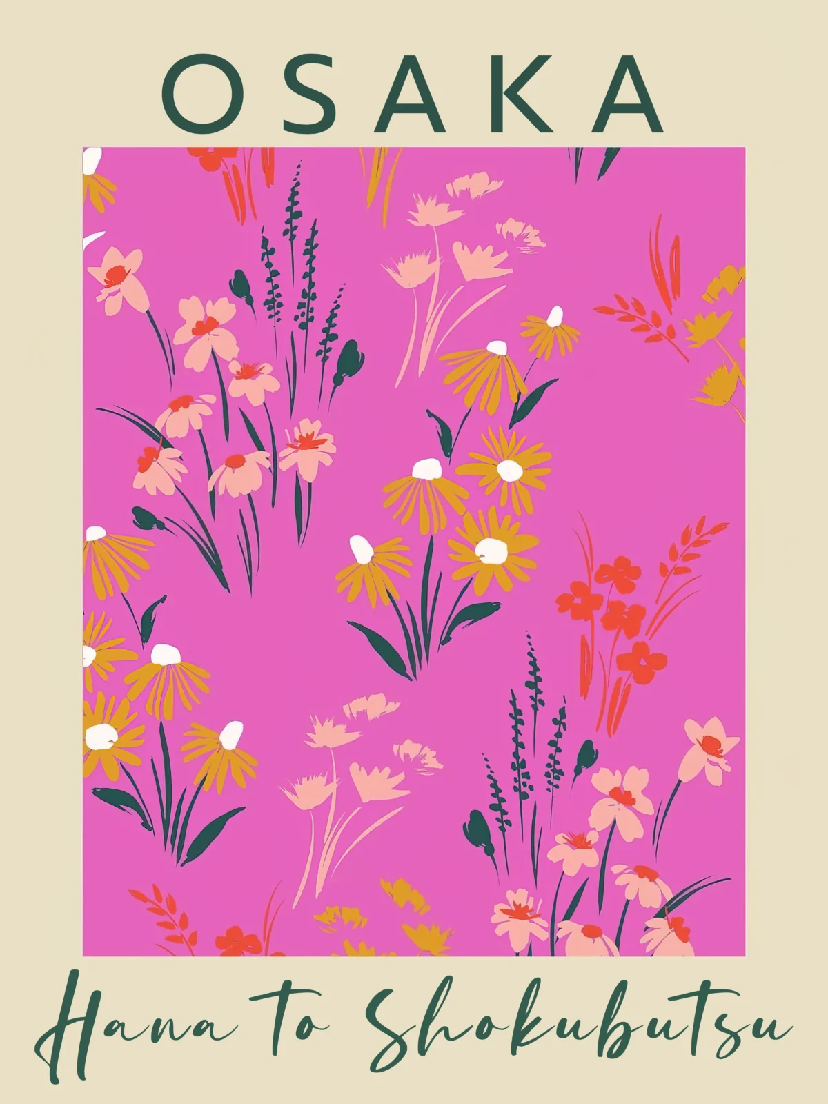 This striking Osaka ‘Hana To Shokubutsu’ poster (meaning Flowers and Plants) captures the vibrant energy of Japan with a bold, illustrative floral design. The artwork features a stunning magenta or hot pink background beautifully contrasted with stylized yellow and peach blooms, rendered in a modern, abstract style. It’s an ideal piece of wall art for injecting immediate color, personality, and a touch of Japanese inspiration into any interior space. The combination of strong colors and fluid lines makes this botanical print a captivating focal point.