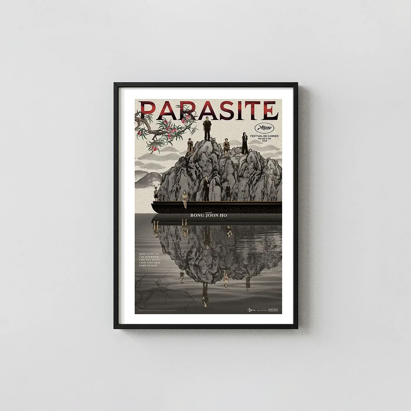 Capture the cinematic brilliance and profound social commentary of Bong Joon Ho’s Oscar-winning masterpiece with this stunning Parasite movie poster. This unique artwork goes beyond a standard promotional image, utilizing a powerful, dualistic composition reminiscent of traditional Asian ink painting (Sumi-e). It strikingly illustrates the social hierarchy theme—the Kim and Park families are precariously positioned on a rocky island, reflecting their inverted reality below the waterline. The inclusion of the Palme d’Or award subtly reminds viewers of the film’s monumental critical success, making this piece essential wall art for serious cinephiles.