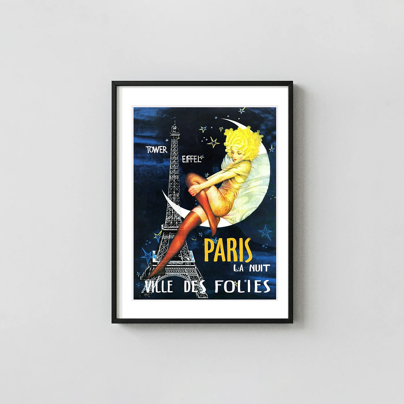 This poster features a mesmerizing illustration against a deep, starry night sky. The majestic Eiffel Tower stands guard, while a glamorous, bright-haired figure lounges seductively upon a shimmering crescent moon. Her golden dress and deep orange stockings reflect the vibrant energy of the era, making this more than just decor—it’s a window into a bygone cultural moment. The bold text proclaiming “PARIS LA NUIT” (Paris by Night) and “VILLE DES FOLIES” confirms its identity as a celebration of the city’s electric evening scene.