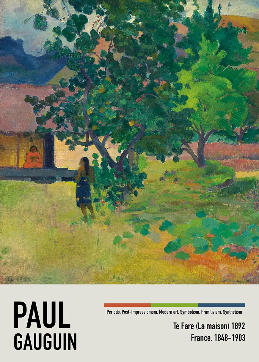 The creation of the Paul Gauguin art print marks a pivotal moment in art history when the artist sought a more primitive and direct form of expression. Having left the urban sprawl of Paris, Gauguin arrived in Tahiti seeking an untouched paradise, though he often encountered a colonial reality. Despite this, his work from 1892, such as Te Fare, highlights his ability to construct a poetic vision of the islands. This specific Tahitian post-impressionist wall art showcases his use of symbolic color, where the warm tones of the ground and the house suggest the heat of the South Pacific sun. The inclusion of two female figures—one partially obscured within the house and another standing near the trees—adds a narrative depth to the scene, inviting the viewer to contemplate the daily rhythms of Tahitian life.