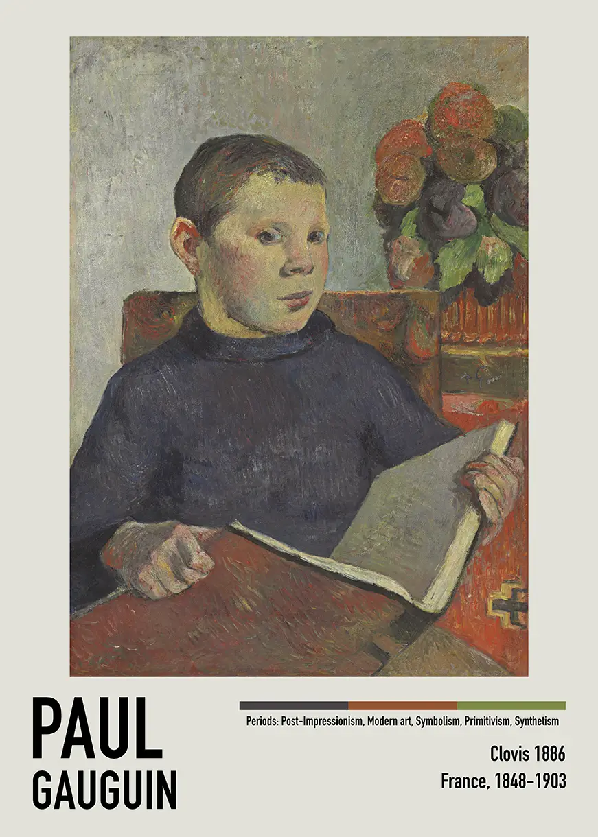 This Paul Gauguin Clovis print captures a tender and psychologically deep moment from the artist’s early Post-Impressionist period. Painted in 1886, this work serves as a significant record of Gauguin’s family life before his more famous travels to Tahiti. The subject, Clovis Gauguin, was the artist’s second son, and he is shown here with a level of gravitas that was uncommon in traditional Victorian-era child portraiture. The composition focuses on the young boy’s intense concentration as he pores over the pages of a large volume, a motif that emphasizes the intellectual curiosity of the subject.