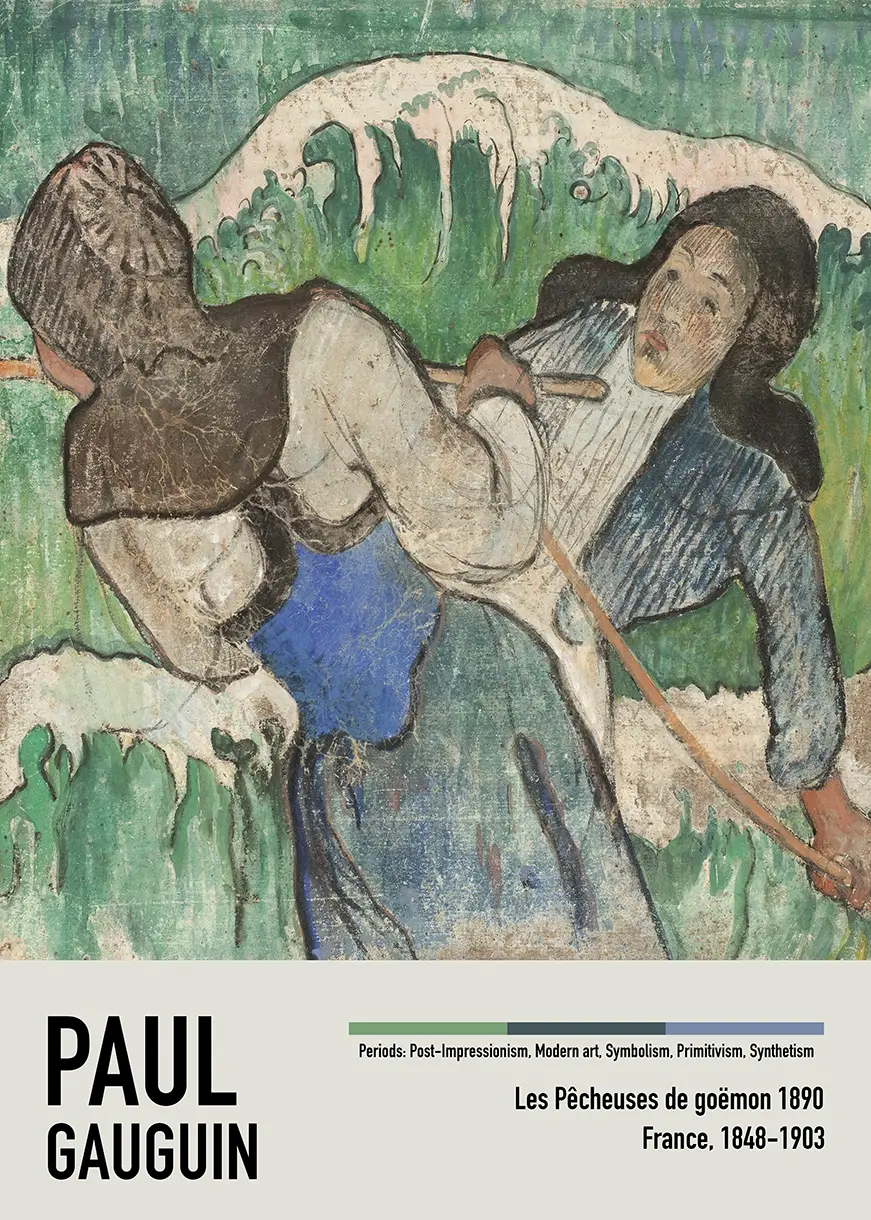 During his time in Brittany, Gauguin sought a primitive purity that he felt was lacking in urban Paris. ‘Les Pêcheuses de goëmon’ represents this search, focusing on the seaweed gatherers whose lives were tied to the tides. This Paul Gauguin poster highlights the strength and resilience of these women, portrayed not as dainty subjects but as monumental figures within the frame. The influence of Japanese woodblock prints is visible in the cropping and the diagonal lines of the gathering tools, which lead the viewer’s eye through the composition.