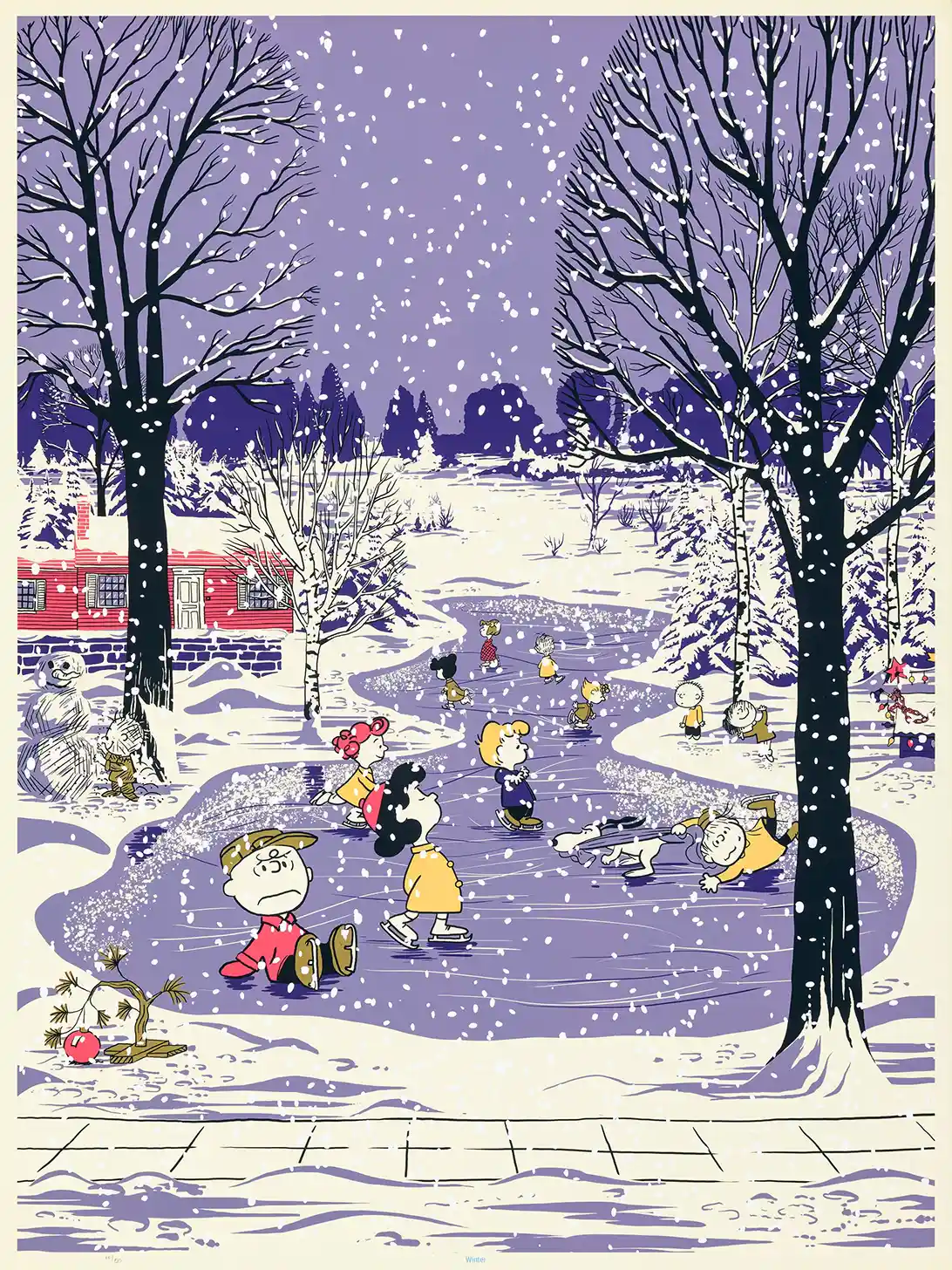 January 15, 2026Peanuts Winter Scene Poster by Chris Thornley | Charlie Brown Ice Skating Art Print