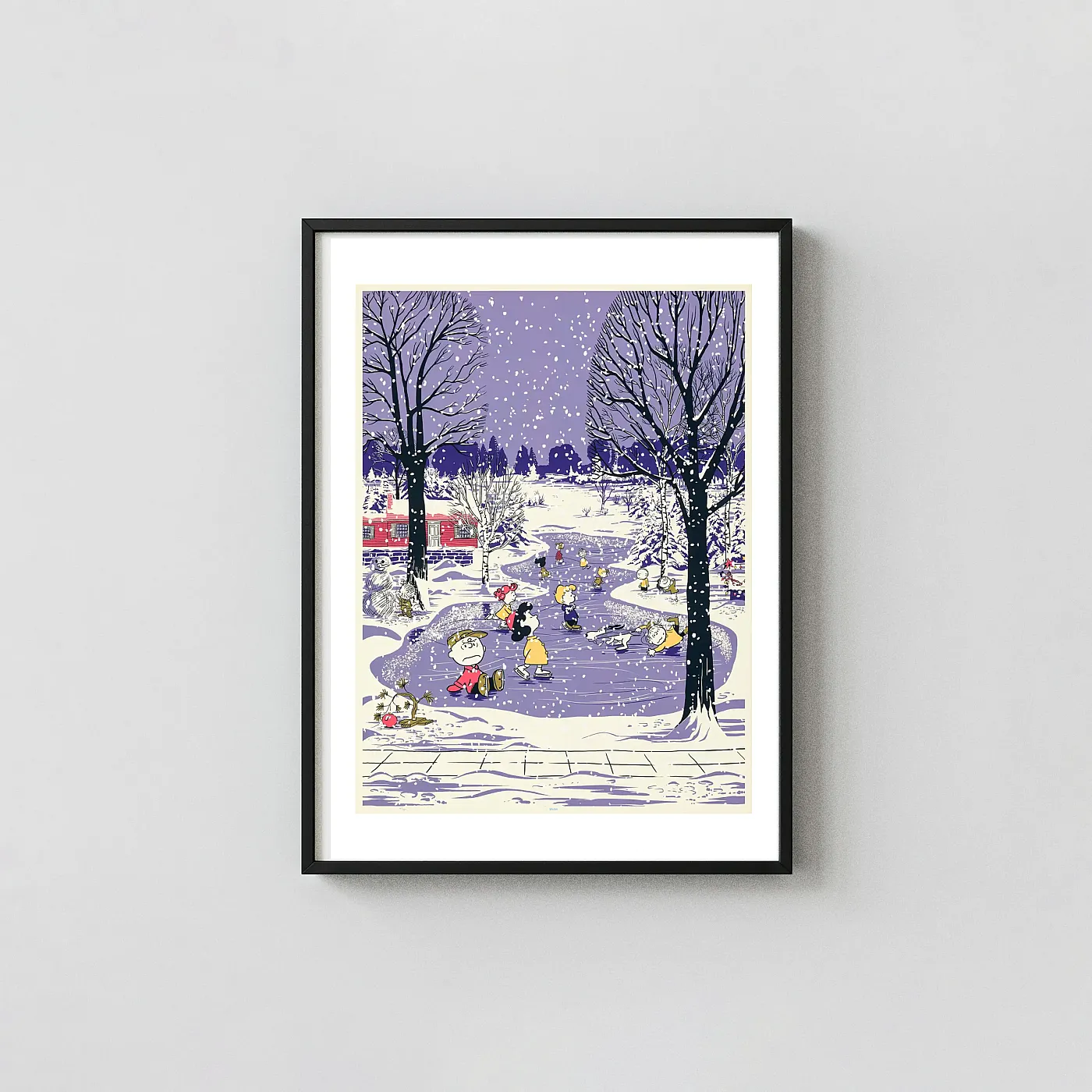 Celebrate winter with this stunning Peanuts art print by Chris Thornley (Godmachine). Features Charlie Brown, Lucy, and Snoopy ice skating in the snow. Perfect classic decor.