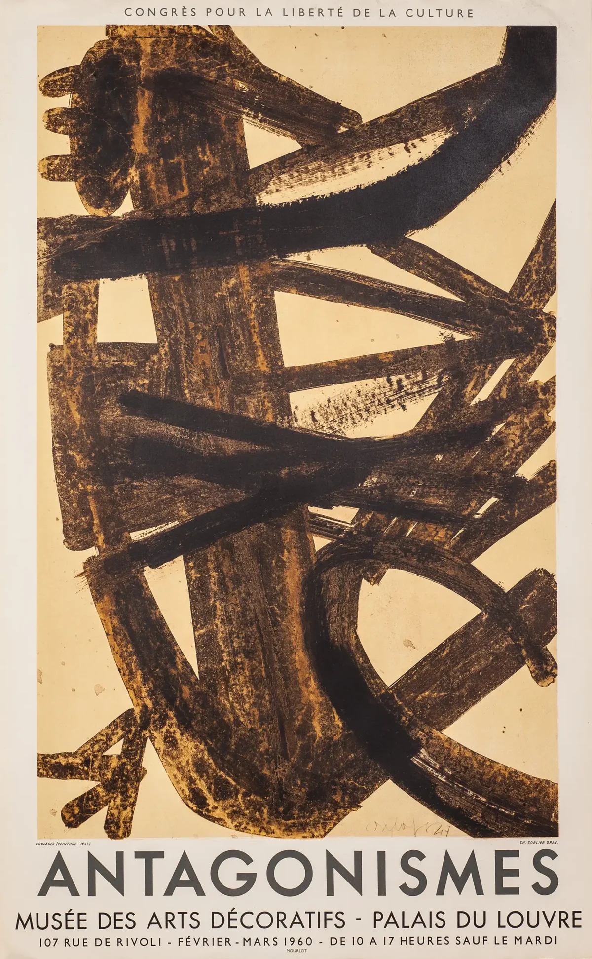 Elevate your space with the Pierre Soulages Antagonismes Abstract Art Poster. Premium quality wall art print capturing the iconic 1960 exhibition design. Shop museum-grade vintage decor now!
