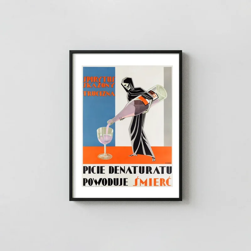 Iconic 1930 Polish public safety poster: ‘Drinking Denatured Alcohol Causes Death.’ Features a striking Art Deco illustration of the Grim Reaper pouring pink poison. H. Czerny design.