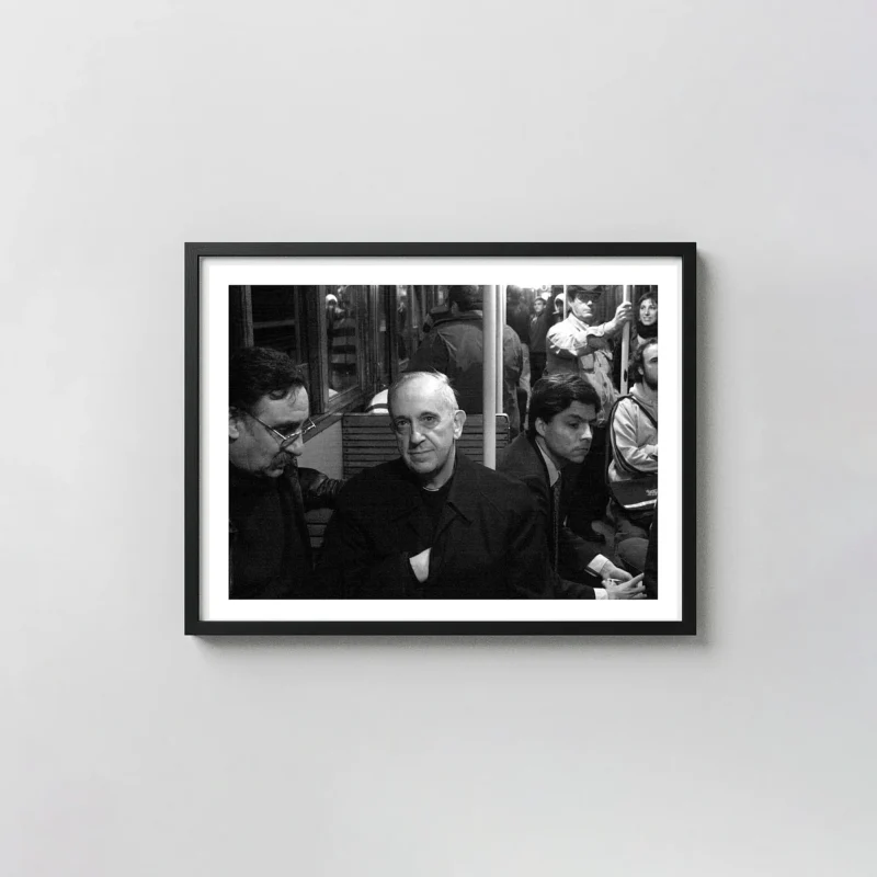 There are photographs that document power, and photographs that document the renunciation of power. The second kind is rarer and harder to make, because power rarely consents to being documented in its absence. The 1998 Buenos Aires subway photograph of Jorge Mario Bergoglio belongs entirely to the second category. At the time it was taken, Bergoglio had been Archbishop of Buenos Aires for less than a year — appointed by Pope John Paul II in February 1998 to lead one of the most important dioceses in Latin America. He could have travelled as his predecessors travelled, with the institutional apparatus of the Church providing the insulation from ordinary life that seniority confers. Instead, he took the train. Not occasionally, not for show, not as a calculated act of humility for the cameras. Simply as a matter of practice, because this is how the people of Buenos Aires moved through their city, and he saw no reason why he should move differently. This Pope Francis black and white wall art documents that practice at the moment when it was still private — before the world was watching, before the image carried the weight of a papacy, when it was simply a photograph of a man on a train.