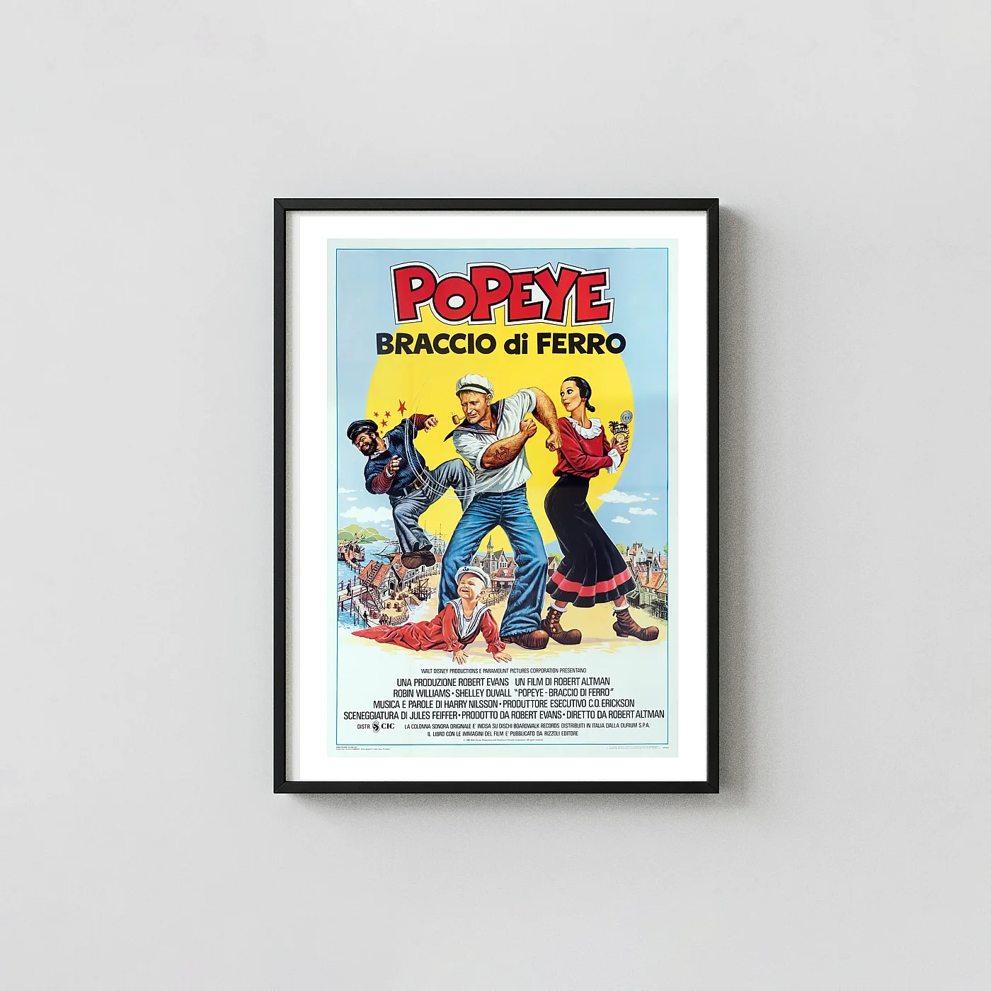 Relive the charm and muscle of the beloved sailor with this stunning reproduction of the iconic 1980 live-action Popeye movie poster. Directed by Robert Altman and starring Robin Williams and Shelley Duvall, this film holds a unique place in cinema history. This poster features the vibrant Italian title, ‘Braccio Di Ferro’ (Iron Arm), capturing a dynamic moment where Popeye is ready to deliver a mighty punch to the bully, while Olive Oyl stands steadfastly by with a can of spinach. This vintage film art is a fantastic piece of movie memorabilia, evoking seaside nostalgia and classic cinematic comedy.