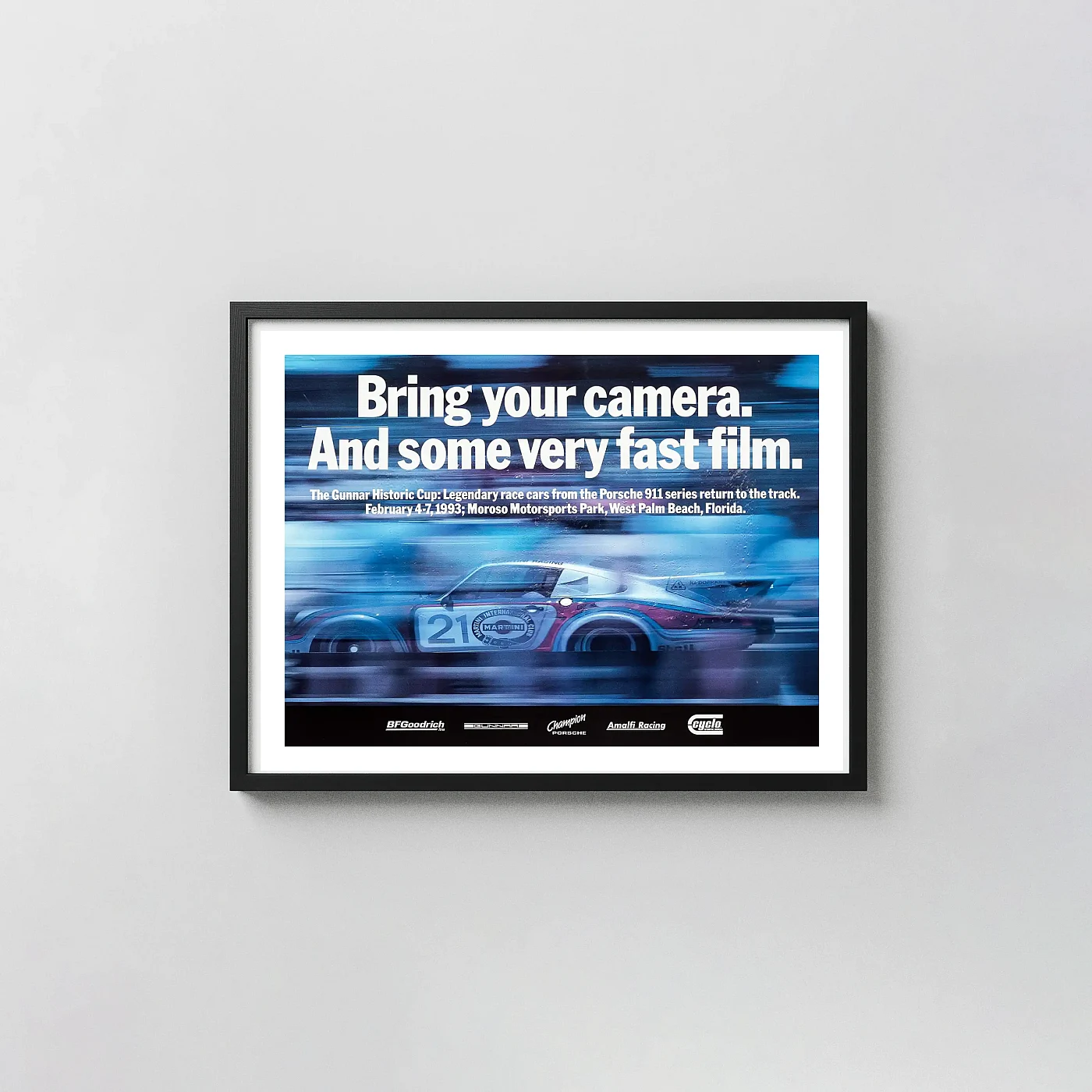 Relive the golden era of endurance racing with this authentic vintage print from the 1993 Gunnar Historic Cup. This striking wall art captures the sheer speed and adrenaline of a legendary Porsche 911 race car, adorned in the iconic Martini International Club livery, blurring past the lens at Moroso Motorsports Park. The poster features bold, retro advertising copy, inviting viewers to appreciate the heritage and raw power of these classic machines. It’s a perfect piece of decor for anyone passionate about Porsche history, vintage advertising, or high-octane motorsport.