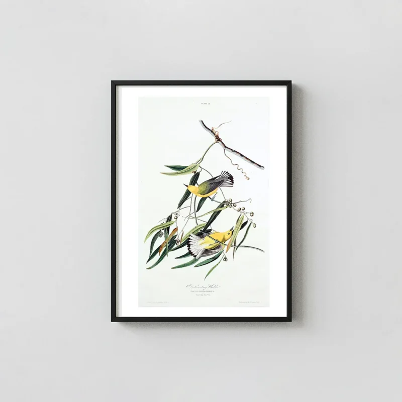 The history of this Prothonotary Warbler print is tied to the monumental effort of producing “The Birds of America.” Audubon traveled extensively throughout the American South, including the swampy regions of Louisiana and Mississippi, to document the bird life found in the wetlands. This specific plate captures the golden plumage of the warbler, a color so distinct it was named after the yellow robes of Roman Catholic prothonotaries. The artist’s attention to detail extends beyond the birds to the intricate structure of the cane vine, with its long, slender leaves and clusters of small berries. By selecting this Prothonotary Warbler print, you are acquiring a piece of natural history that helped define the field of ornithology in the United States.