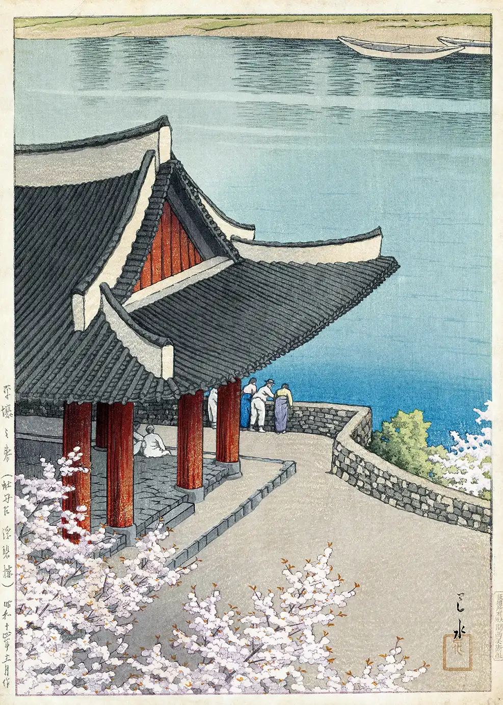 This Pubyong Pavilion print offers a serene glimpse into the architectural heritage of 1939 Pyongyang, capturing a moment of seasonal change during the height of the spring bloom. The composition centers on the iconic structure, characterized by its heavy, dark-tiled multi-tiered roof and vibrant red supporting pillars. Located at the Modan viewpoint, the pavilion serves as a vantage point for figures dressed in traditional period attire who look out across the expansive blue waters of the river. The presence of cherry blossoms in the foreground adds a layer of soft texture and tonal contrast against the solid geometry of the building, creating a balanced 1939 Korean landscape art piece that reflects the aesthetic values of early twentieth-century printmaking.