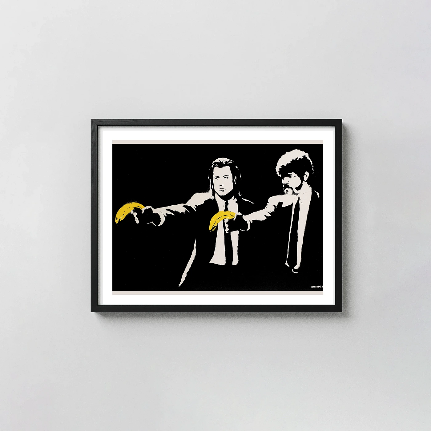 Iconic Pulp Fiction Poster featuring Banksy’s famous banana stencil design. Premium quality wall art, perfect for film fans and collectors. Shop this unique print now!