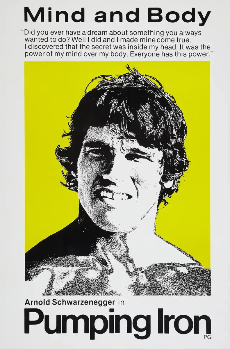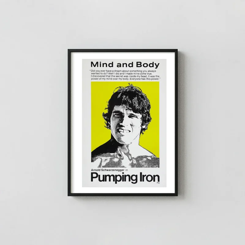 Capture the raw intensity and motivation of the legendary 1977 documentary, Pumping Iron. This striking visual features Arnold Schwarzenegger during his prime bodybuilding days, set against a bold, high-contrast black and neon yellow design. The poster captures the film’s core philosophical message: “Mind and Body,” emphasizing the power of mental discipline over physical limits. This isn’t just a movie poster; it’s a powerful piece of inspirational wall art, perfect for those who live by the mantra of training and dedication.