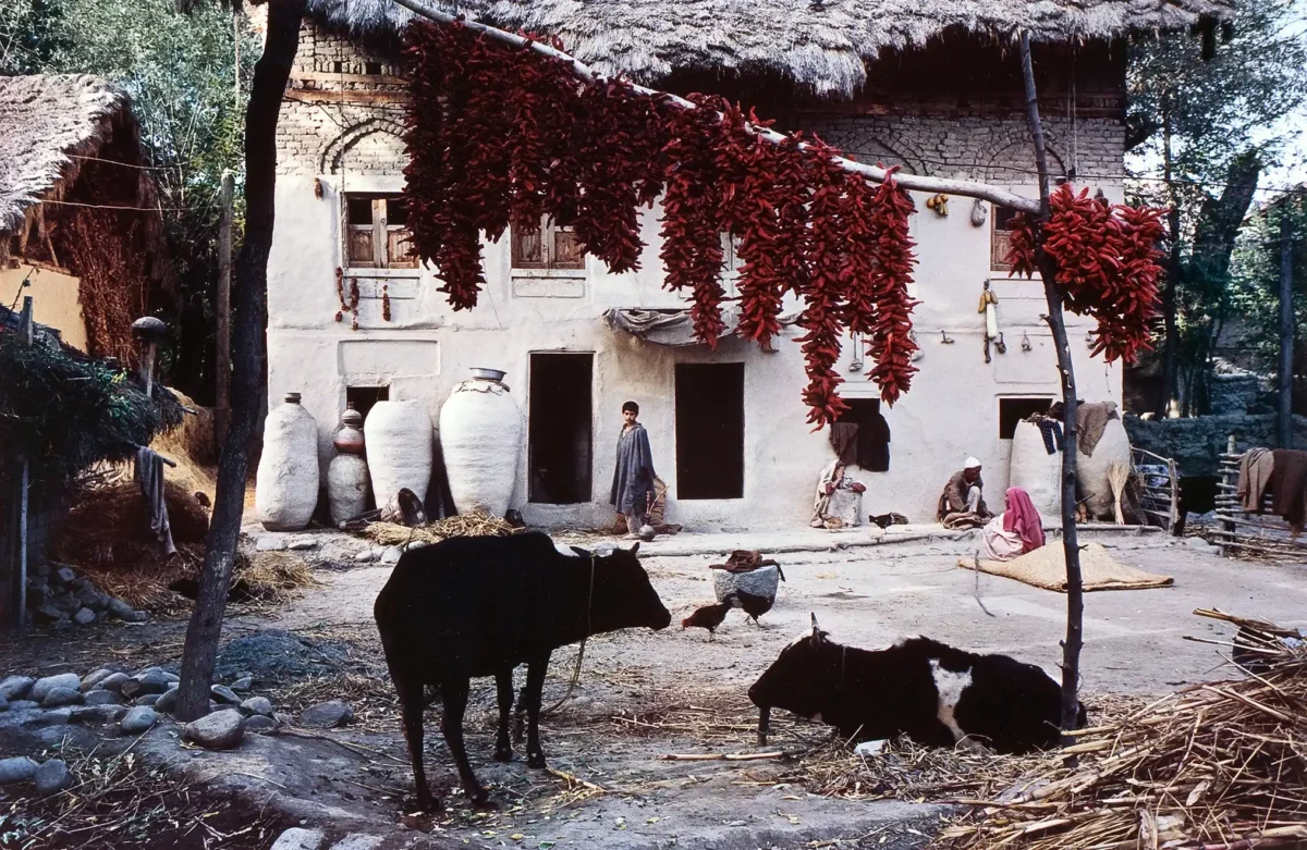 The dominant feature—cascades of rich, hanging red chili peppers—creates a dramatic, colorful canopy, contrasting beautifully against the muted earth tones and the dark silhouettes of the cattle and villagers. This famous photography print is a masterful example of Singh’s dedication to documenting the rapid changes and enduring traditions of India.