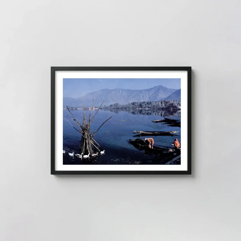 This Raghubir Singh print shows two Kashmiri women on Dal Lake in 1982 — gathering lotus leaves from a wooden boat while ducks move around them, the whole scene rendered with Singh’s fully saturated color and his ability to make the ordinary feel like the exact right frame to stop in. Dal Lake Kashmir print work doesn’t get more specific than this: lotus leaves photo art that is also India color photography at its most visually complete. This Raghubir Singh print earns its place in Singh’s 1982 Kashmir body of work — one of his richest series.