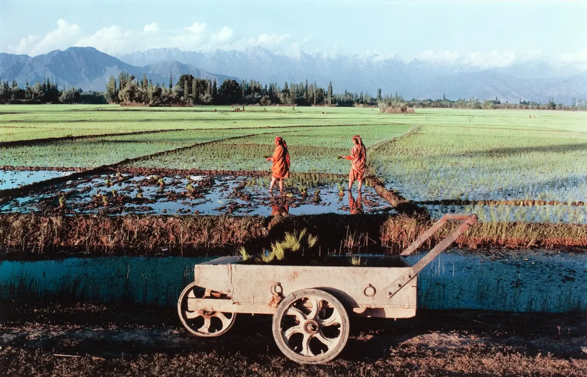 This Raghubir Singh print documents women transplanting paddy on the outskirts of Srinagar in 1983 — the vivid greens of the rice fields, the Kashmir valley light, and the labor of the planting season rendered in Singh’s signature saturated color.