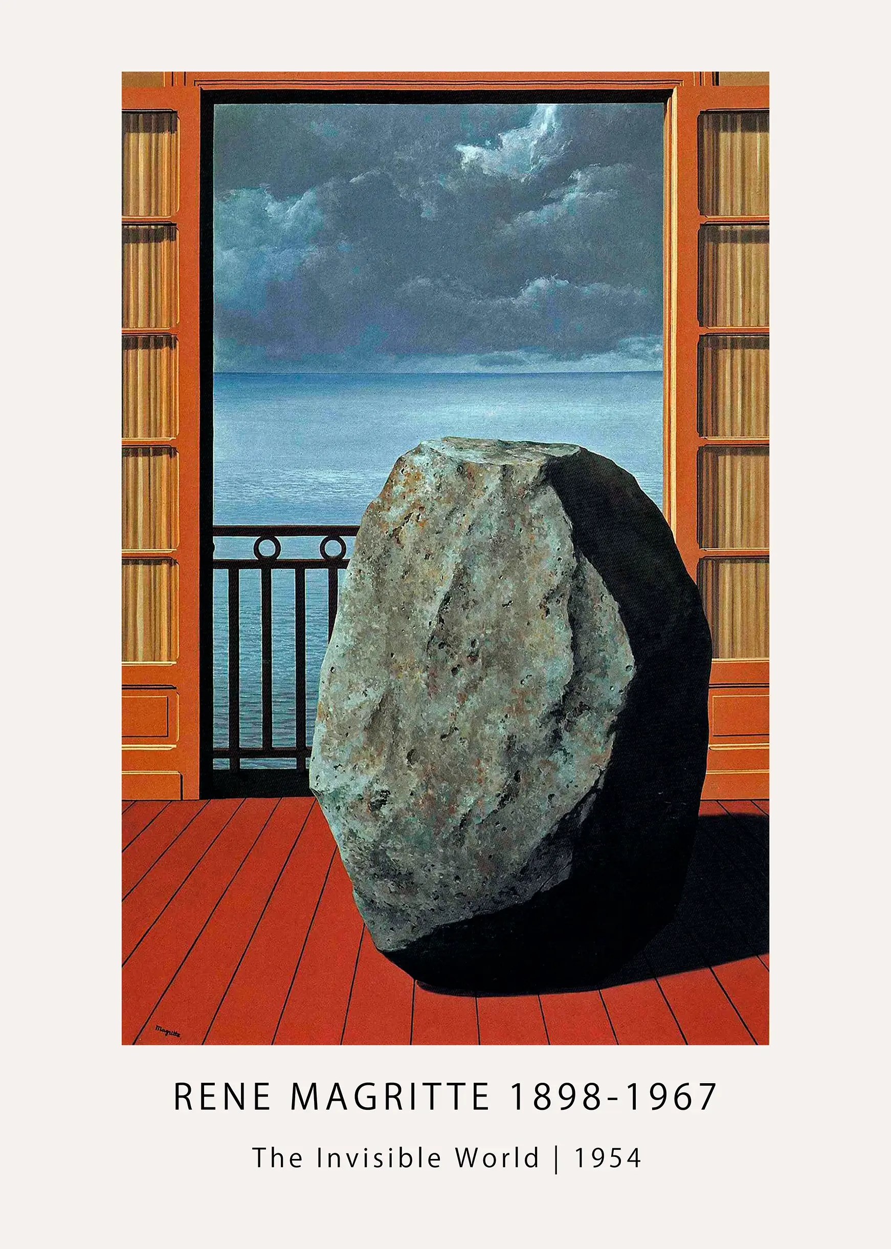 This Rene Magritte Poster presents a faithful reproduction of “The Invisible World” from 1954, a seminal work that captures the Belgian artist’s obsession with the hidden reality behind the visible. The composition depicts a massive, textured boulder sitting quietly on a wooden balcony, positioned before an open door that looks out onto a calm sea and a heavy, brooding sky. By placing a heavy, terrestrial object in an indoor setting overlooking a vast horizon, Magritte challenges the viewer to question the logic of space and the nature of existence.