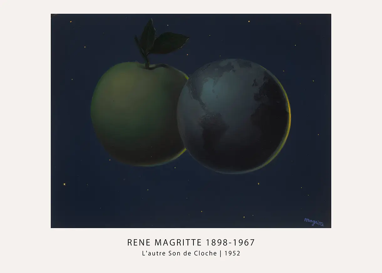 A Rene Magritte print serves as a gateway into the Belgian surrealist’s interrogation of reality and representation. This 1952 composition, titled L’autre son de cloche (The Other Sound of the Bell), presents a striking visual paradox characteristic of Magritte’s mature period. The image centers on two celestial spheres: a textured green apple and a terrestrial globe, suspended against a flat, serene blue backdrop punctuated by distant, pale stars. By placing a common piece of fruit on equal footing with the entire world, Magritte challenges the observer to reconsider the scale, importance, and familiar nature of everyday objects. The lighting on both the apple and globe suggests a consistent light source from the left, casting a soft shadow on the right side of the spheres, which creates a three-dimensional effect that contrasts with the minimalist, two-dimensional nature of the starry sky.