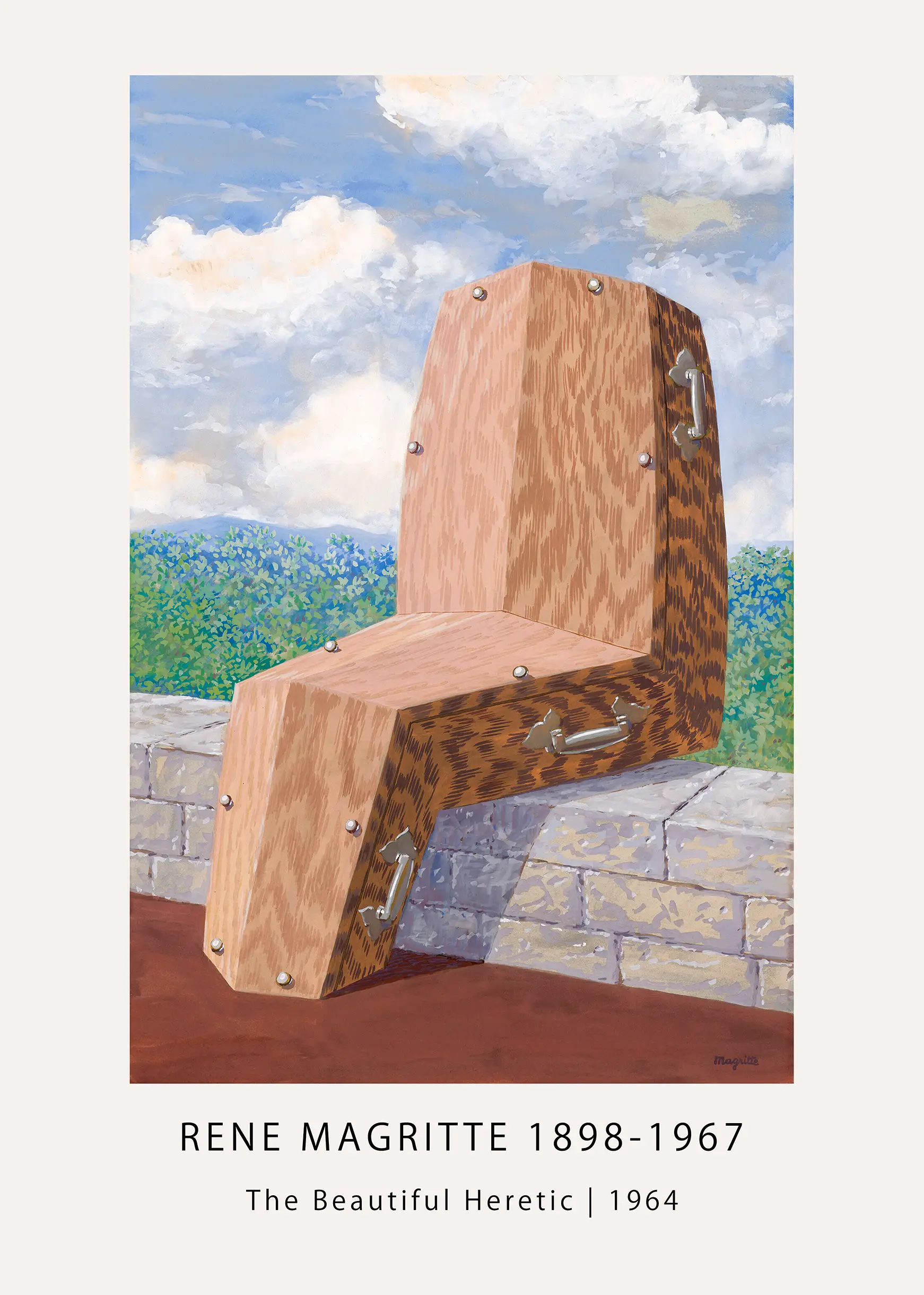 This Rene Magritte print provides a high-fidelity reproduction of the 1964 work, The Beautiful Heretic. The image features a wooden casket positioned in a human-like seated posture upon a weathered stone ledge. The juxtaposition of a funeral object with a casual, relaxed pose creates the characteristic tension found in Belgian surrealism. The wood grain is meticulously detailed, showcasing swirling natural patterns that give the central object a heavy, tactile quality. Above the horizon, a bright blue sky filled with soft, white clouds provides a light-hearted backdrop to the otherwise somber subject matter. Below the wall, a deep reddish-brown ground anchors the composition, providing a stable foundation for the bizarre visual narrative.
