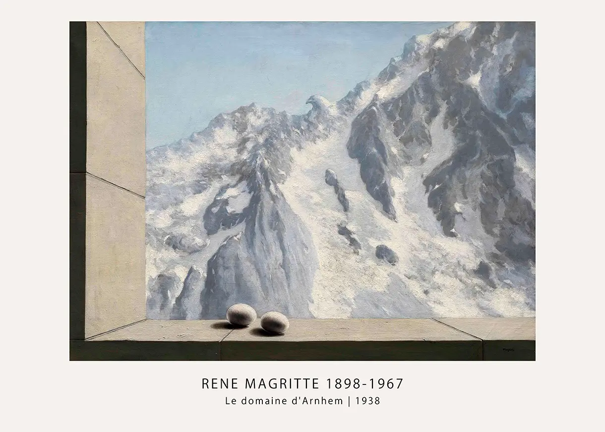 This Rene Magritte Print offers a precise reproduction of the 1938 oil painting Le domaine d’Arnhem, one of the most significant works from the Belgian surrealist’s career. The composition presents a large mountain range where the jagged, snow-covered peaks form the distinct shape of a predatory bird, specifically a giant eagle with its wings spread across the horizon. In the immediate foreground, Magritte places two white eggs on a cold, stone ledge, creating a stark contrast between the monumental scale of the mountain and the fragile, organic nature of the eggs. This juxtaposition is a hallmark of Magritte’s method, forcing the viewer to reconsider the relationship between the natural world and the structures of perception.