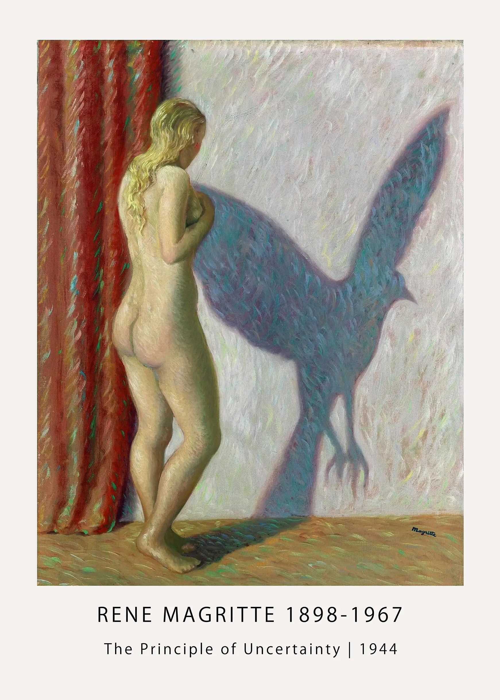 The red curtain draped on the left side of the frame serves as a theatrical device, a recurring motif in Magritte’s work that suggests the world is a stage or a series of concealed truths. The interplay between the solid female form and the ethereal avian shadow invites deep contemplation regarding the nature of the self and the hidden dimensions of the psyche. By choosing a Rene Magritte print of this specific era, you are acquiring a piece that represents a pivotal moment in the artist’s career when he sought to find beauty and light amidst the darkness of global conflict. This surrealist art poster remains one of the most intriguing entries in his mid-century catalog.