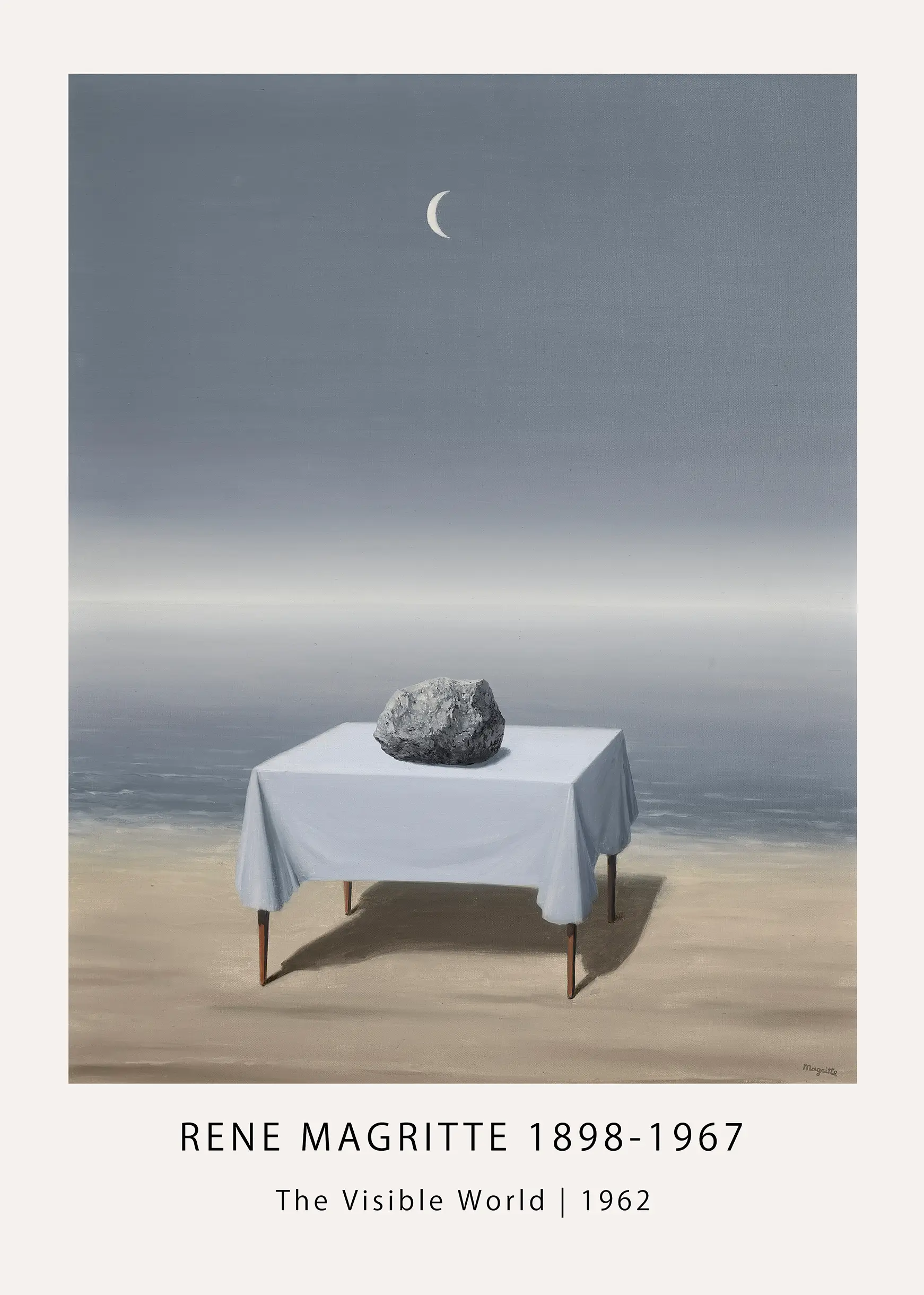 This Rene Magritte print presents a faithful reproduction of the 1962 painting Le Monde Visible, an iconic work from the artist’s later period. The composition features a large, unyielding stone placed upon a wooden table covered by a crisp white cloth. This arrangement is situated on an empty coastal stretch where the sand meets a calm sea. Above, a uniform grey sky is illuminated only by a delicate crescent moon, creating a sense of quietude and intellectual provocation. This piece serves as a prime example of the Belgian artist’s ability to create mystery through the juxtaposition of mundane objects in unexpected settings.
