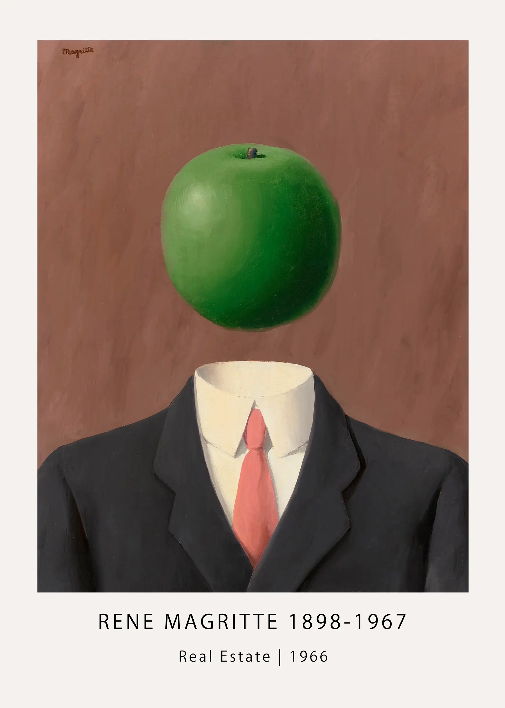 Rene Magritte Real Estate is a hallmark of 20th-century Belgian surrealism, illustrating the artist’s obsession with the hidden and the visible. Painted in 1966, shortly before his death, this piece encapsulates the mature style of a man who spent his life questioning the nature of representation. The image features a standard dark business suit, a white shirt, and a red tie—uniforms of the middle-class professional—yet replaces the face with a singular, floating green apple. This juxtaposition creates a jarring visual tension that forces the viewer to confront the anonymity of the modern worker. By removing the individual’s features, Magritte invites us to consider what lies behind the surface of everyday objects.