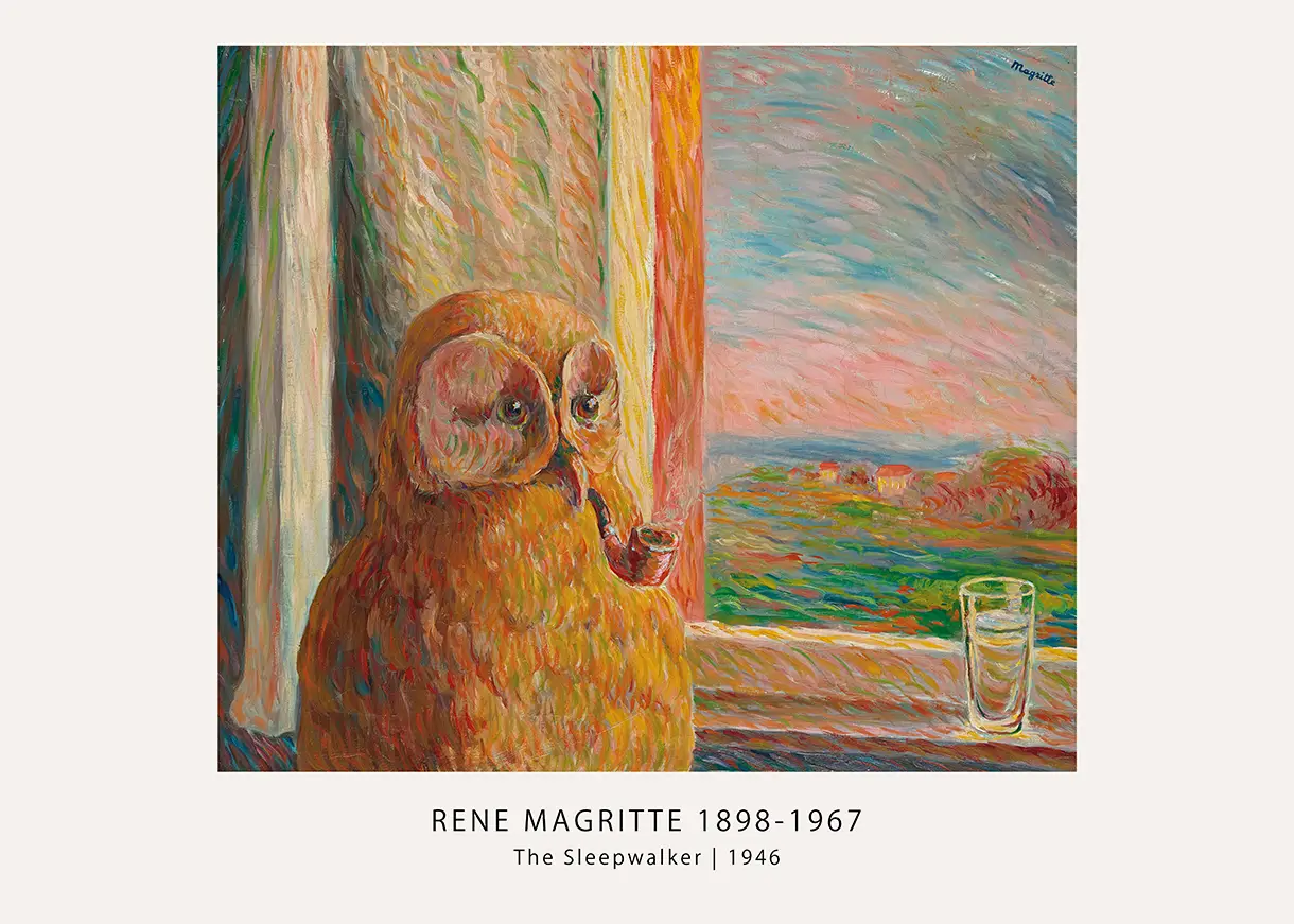 The Rene Magritte Sleepwalker print showcases an unusual departure from the artist’s later clinical style, offering a glimpse into his experimental period during the mid-1940s. In this specific work from 1946, the Belgian surrealist adopts a technique reminiscent of the impressionists, utilizing thick, visible brushstrokes and a vibrant palette of pinks, oranges, and greens. The central figure is a large, textured owl perched prominently on a windowsill. The bird holds a smoking pipe in its beak, a recurring motif in the artist’s career that challenges the viewer’s perception of objects and their intended uses.