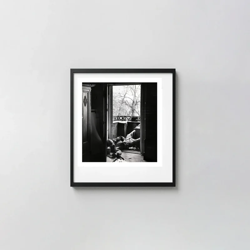 This Robert Capa print belongs to his WWII documentation — made in 1945 as the war reached its closing phase and Capa was still in the field, pressing as close as the action allowed. Capa co-founded Magnum Photos and built his reputation on a simple principle: if your pictures aren’t good enough, you’re not close enough. This war photography print is close enough. The Robert Capa print carries the visual grammar of frontline documentary photography: grain, urgency, and the particular quality of light that only comes from working fast under real conditions.