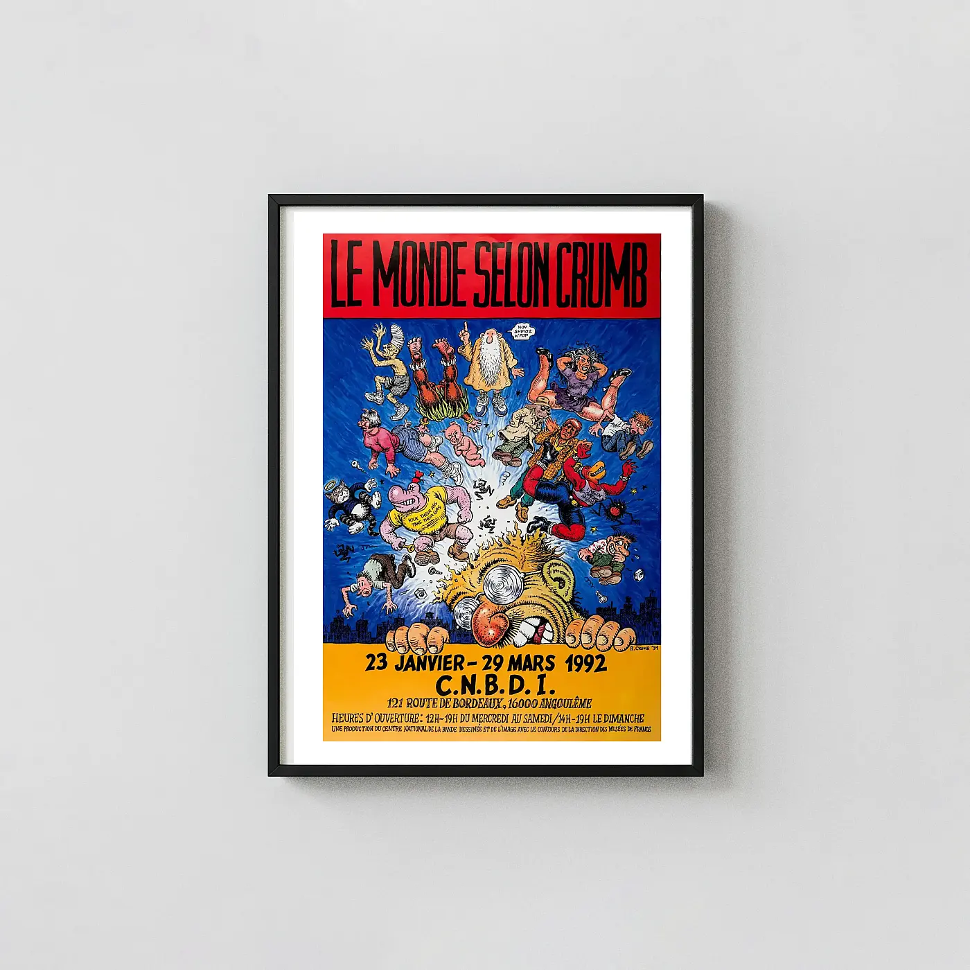 This powerful wall art captures the chaotic brilliance of Robert Crumb, the undisputed king of underground comix. Originally designed in 1991 for the legendary 1992 French exhibition “Le Monde Selon Crumb” (The World According to Crumb), this piece explodes with Crumb’s signature style: grotesque, highly-detailed, and utterly unique characters flying across a vibrant blue background. It’s a snapshot of counter-culture history, featuring the frantic energy and darkly satirical humor that defined his groundbreaking work. This vintage exhibition poster is an essential piece of wall decor for any serious graphic novel or fine art collector.