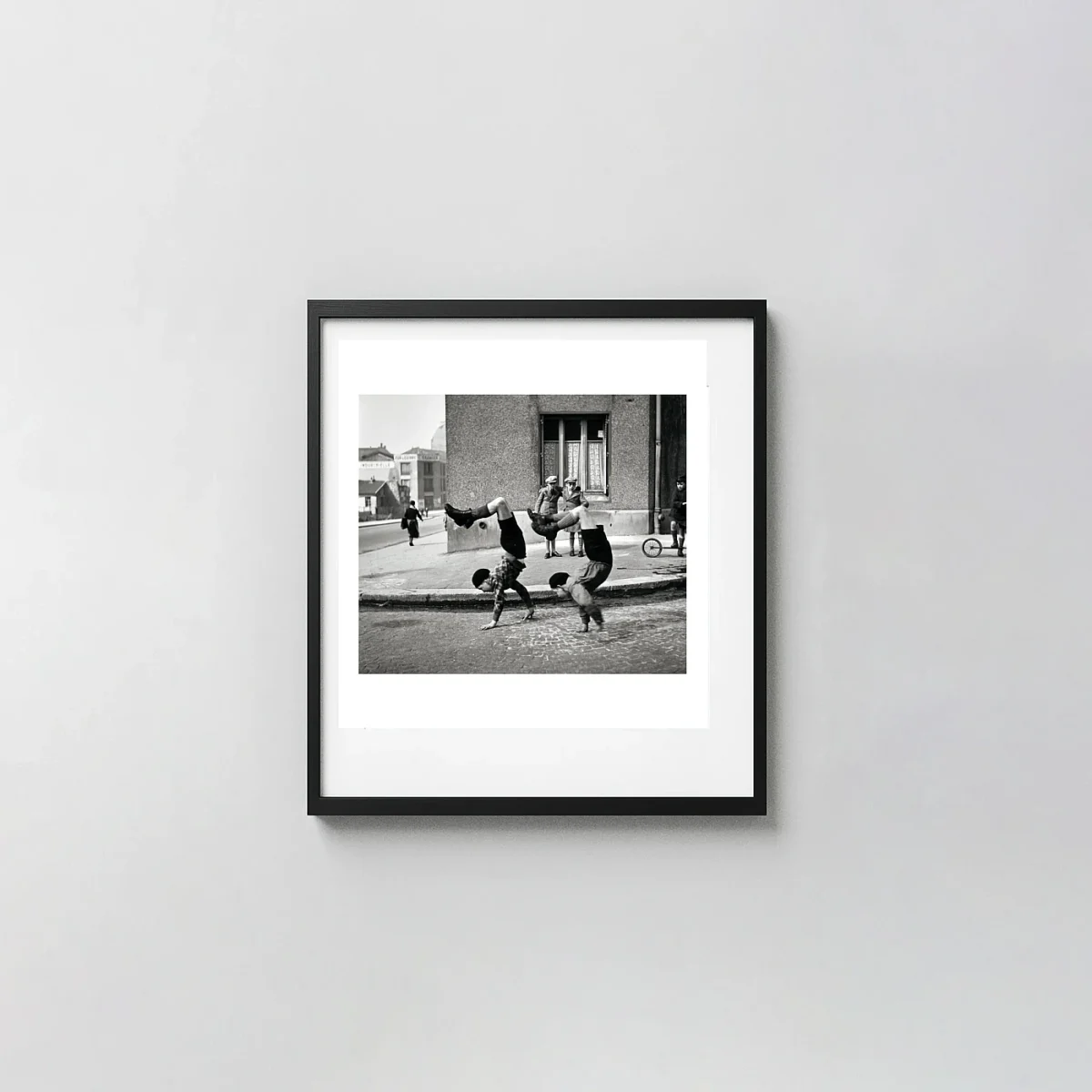 This Robert Doisneau print shows two brothers performing acrobatics on a Paris street — walking on their hands while two well-dressed boys and a passing woman look on with varying degrees of interest.