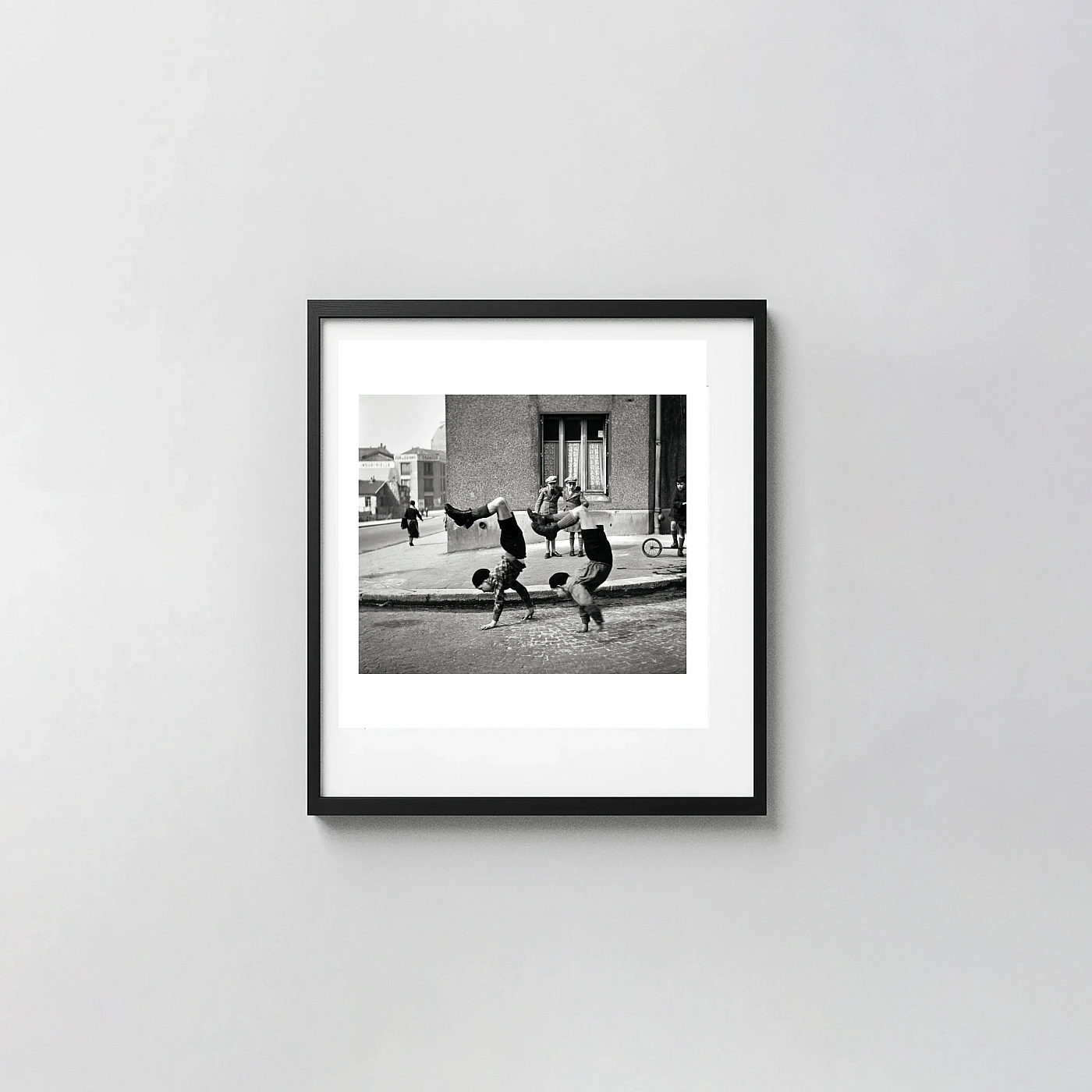 This Robert Doisneau print captures two young acrobats walking on their hands along a Paris street — their mirror-image bodies, bérets, and easy athleticism contrasted against the buttoned-up boys watching from the pavement. The Les Frères print is one of Doisneau’s most compositionally rich early images: a Paris street photo where the frame holds two separate worlds in the same moment. This Robert Doisneau print is vintage Paris art with genuine social poetry inside it.