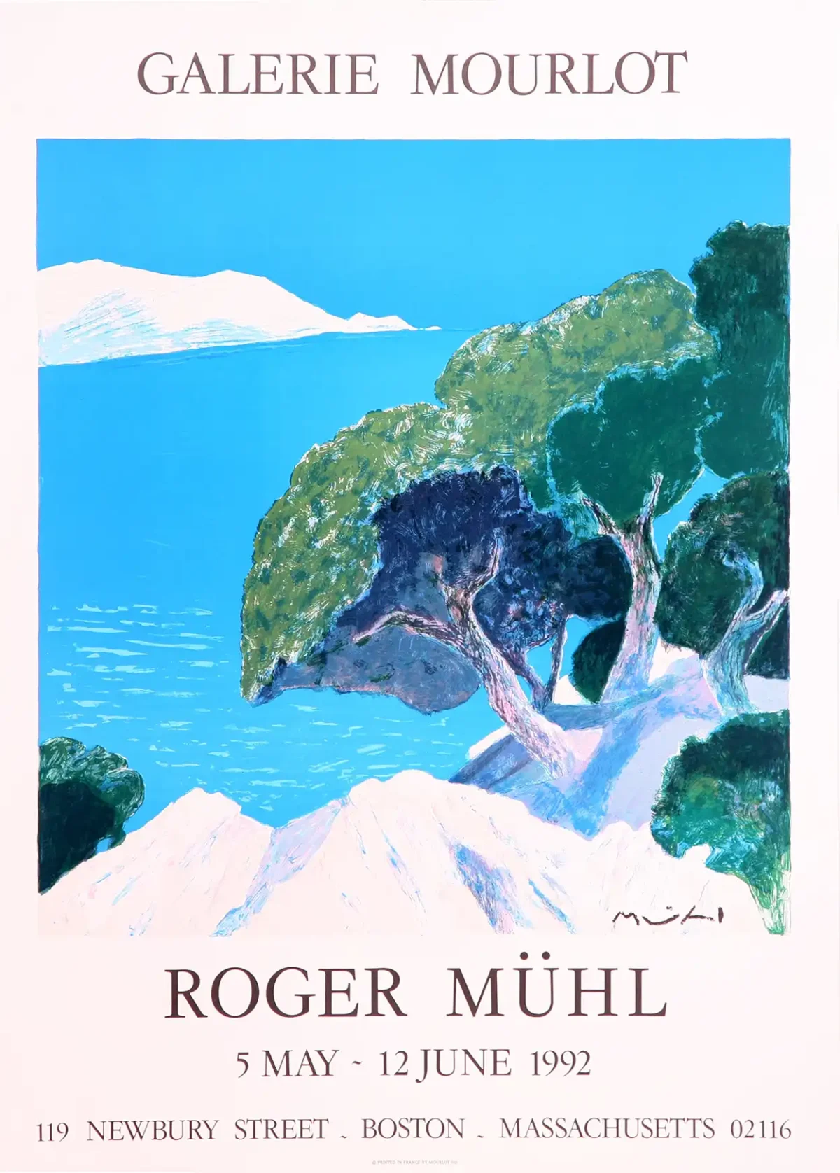 Capture the vivid light of the French Riviera with this iconic exhibition poster by celebrated French artist, Roger Mühl. Originally created for his 1992 show at Galerie Mourlot, this vibrant lithograph captures a stunning view of Les Îles de Lérins. Mühl’s distinctive style utilizes bold blocks of Mediterranean color—azure blue for the sea and sky, complemented by rich, textural greens defining the coastal trees and shimmering white rocks. This piece is more than just wall art; it is a timeless snapshot of modern landscape painting, bringing the tranquility and warmth of the South of France directly into your home decor.