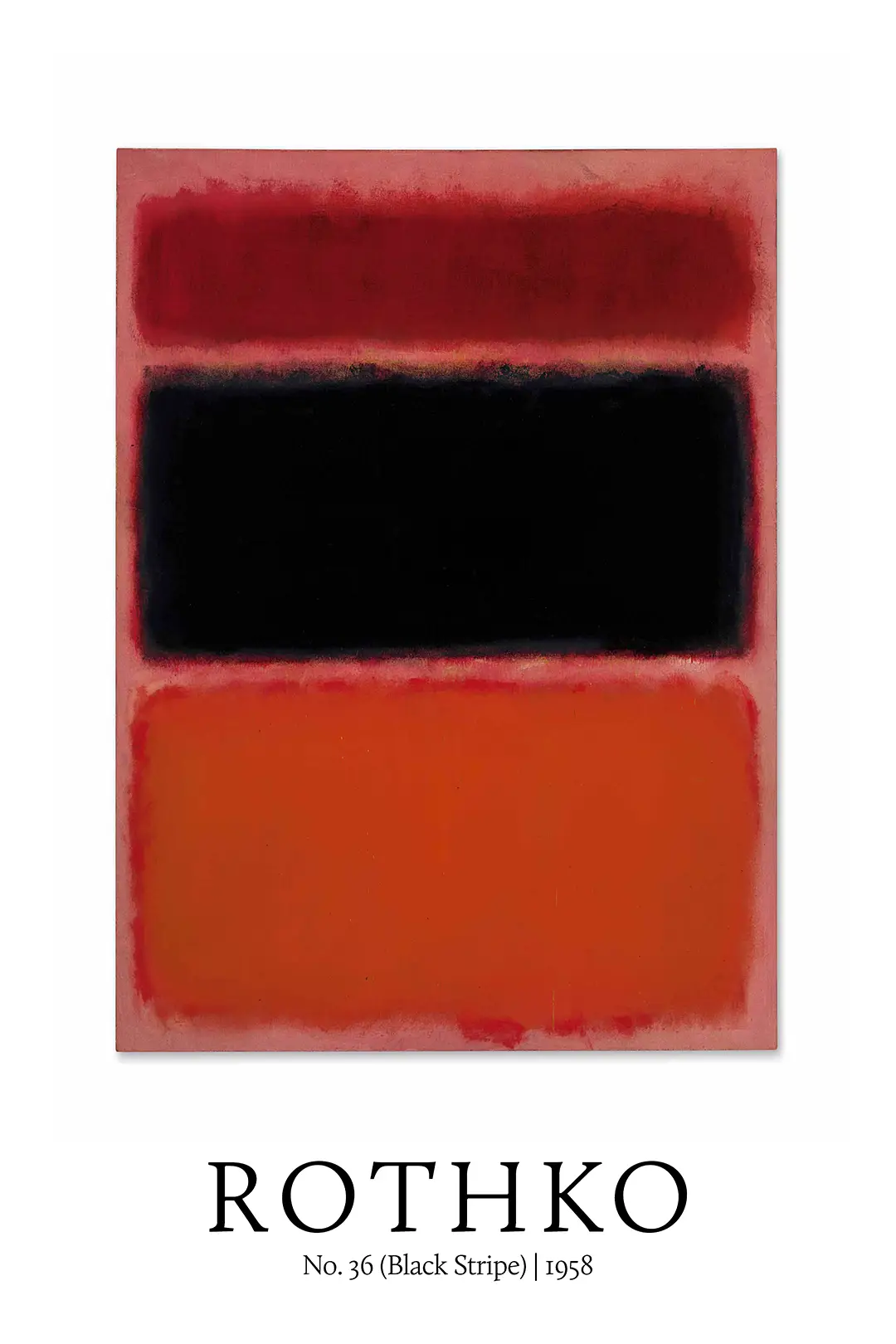This Rothko exhibition poster reproduces the iconic 1958 work “No. 36 (Black Stripe),” a pivotal example of the American abstract expressionist movement. The composition features three stacked horizontal rectangular forms with softened, feathered edges that appear to hover over a deep maroon-red ground. This specific reproduction focuses on the intense interplay between the top maroon band, the central void-like black stripe, and the lower field of vibrant orange. For collectors seeking to introduce high-fidelity color field studies into their space, this print offers a rigorous commitment to the saturation and tonality found in the original canvas.